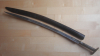 Gegengekrümmte Klinge (Damast?) mit wulstigem Klingenrücken und beidseitigem Mittelgrat der zur Rückenspitze hin pfeilförmig ausläuft.