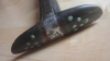 Griffstück aus zwei dunkelbraunen, jeweils mit 3 Nieten an der Angel befestigten Horngriffschalen.