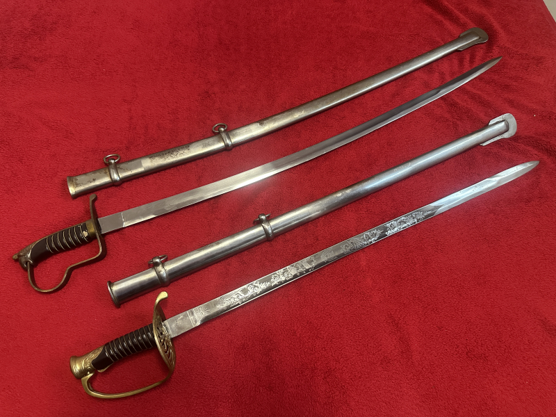Aus Sammlung die beiden Exemplare ,die Klinge bei dem Degen beidseitig geätzt,noch gute Erhaltung -Substanz wie aus den Bildern ersichtlich.Zustand,Herkunft und alles weitere den Bildern entnehmen damit keine Diskussionen später.Länge 96 cm bzw. 113 cm (wobei bei dem Säbel die Klinge nicht ganz in die Scheide reingeht.Von privat ab 1€ ohne Rücknahme.EU-Länder Auslandversand 35€.