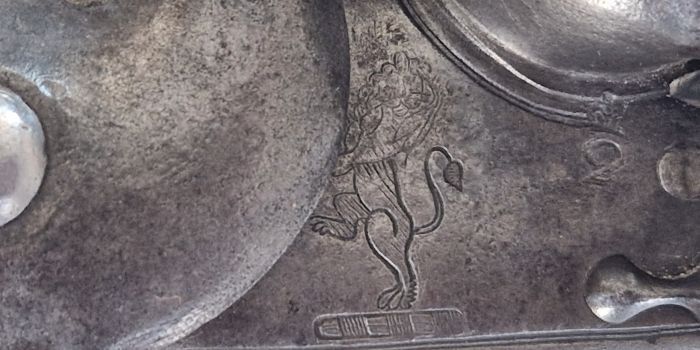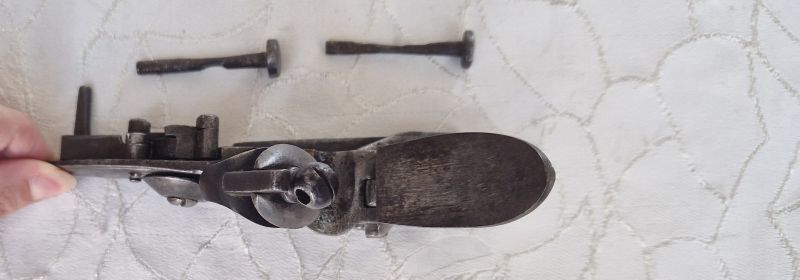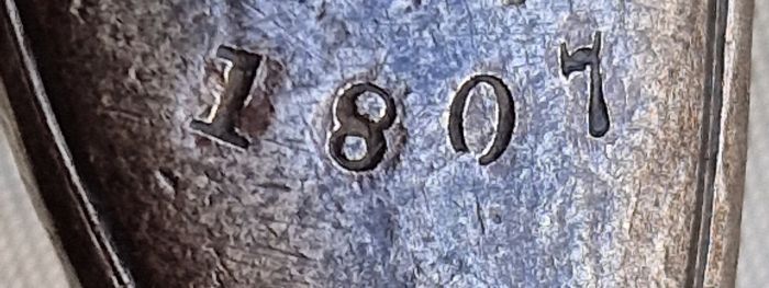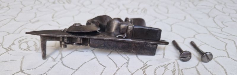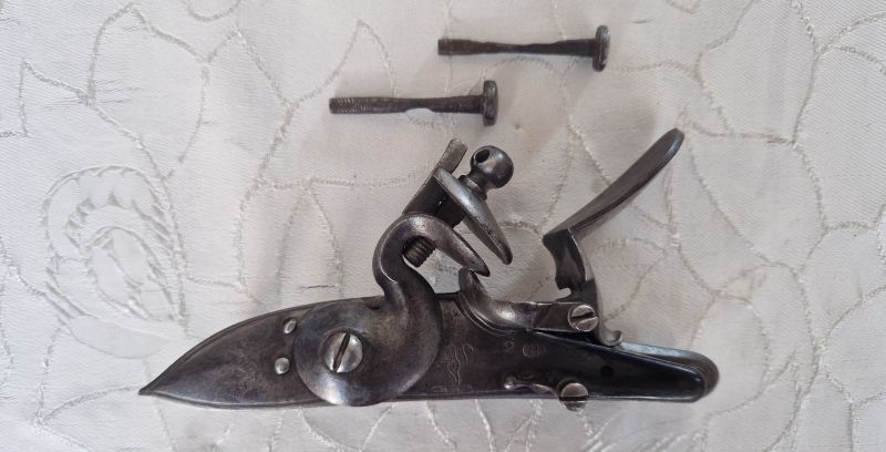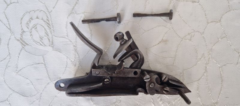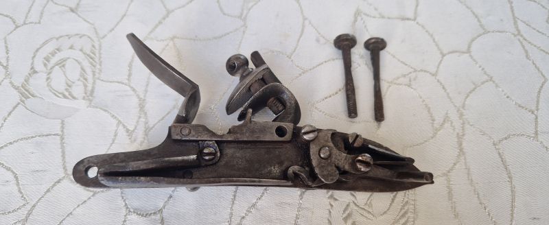 Gewölbte Schloßplatte und Hahn. Platte im hinteren Bereich 1807 sowie stehender Löwe und Nummerierung 2. Zwei Rasten. Beste Funktion. Originale Innenteile. Dazu 2 alte Schloßschrauben.