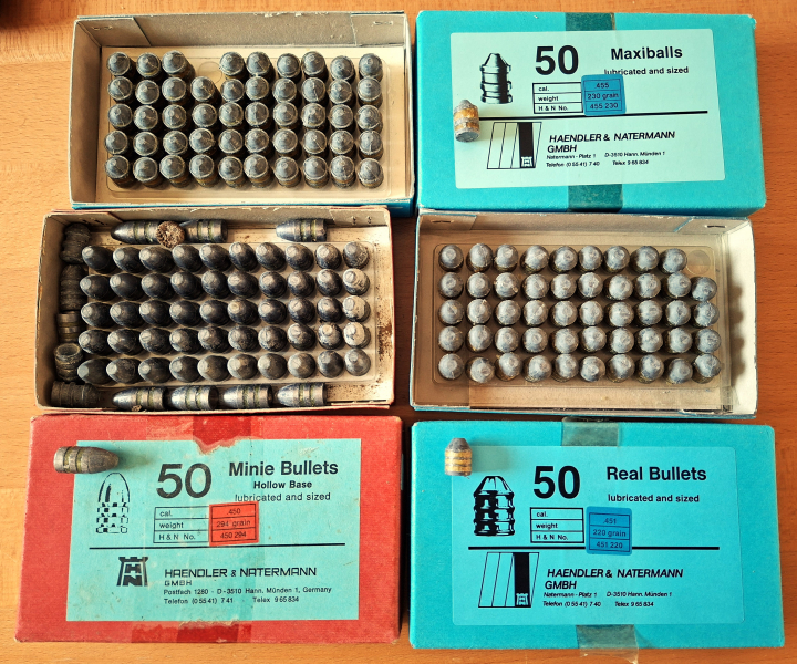 Aus Nachlass abzugeben: H&N Maxiballs cal. .455(230grs)+ Real Bullets cal. 451(230grs)+ Minie Bullets cal. 450 (294grs) Menge und Zustand siehe Foto! Teilweise leicht Oxidiert, da wohl schon älter. Haftungsausschluss: „Der Verkauf erfolgt unter Ausschluss jeglicher Sachmängelhaftung“, Privatverkauf: Keine Garantie, Gewährleistung, Umtausch oder Rücknahme. KEIN VERSAND INS AUSLAND!!