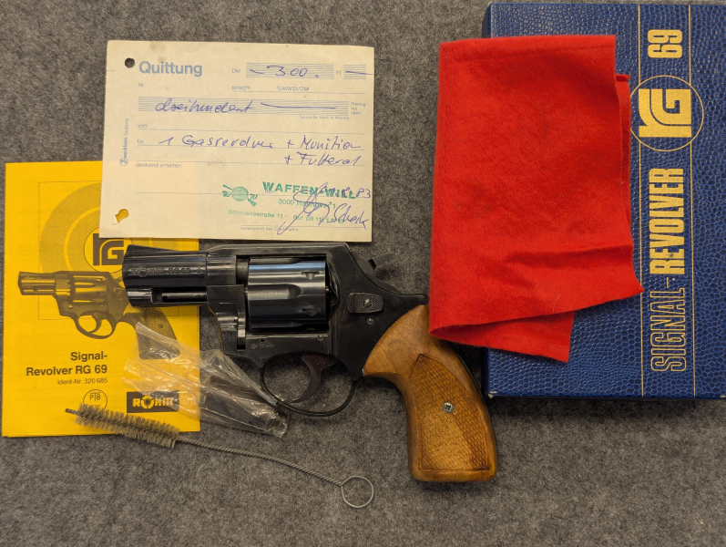 Es handelt sich um das Modell RG 69 mit 6 Schuss im Kaliber 9mm Revolver Knall.