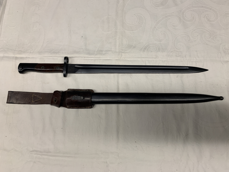 Jugoslawisches Bajonett Mod. 1924 mit Koppelschuh. Hergestellt bei Arsenal in Kraguyvac, Jugoslawien. Das Bajonett und die Scheide sind nummerngleich ( 6104 ). Es ist in einem guten gebrauchten Zustand. Der Drücker funktioniert. Bei dem Koppelschuh sind die Nähte fest und nichts ist nachgenäht. Bajonett Gesamtlänge 51,5 cm, Klingenlänge 38,5 cm, Laufring innen 15,5 mm. Privatverkauf, keine Garantie oder Rücknahme.
