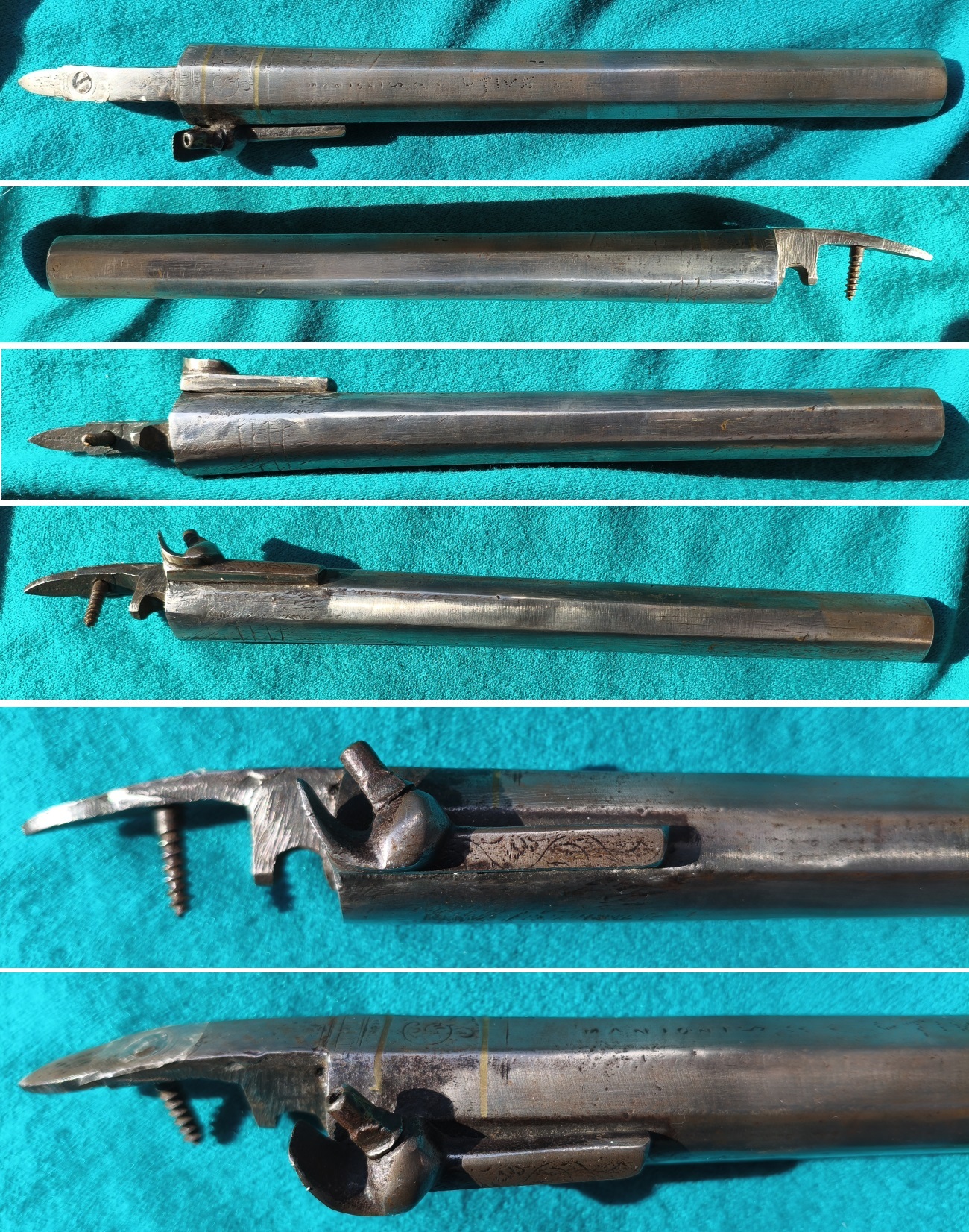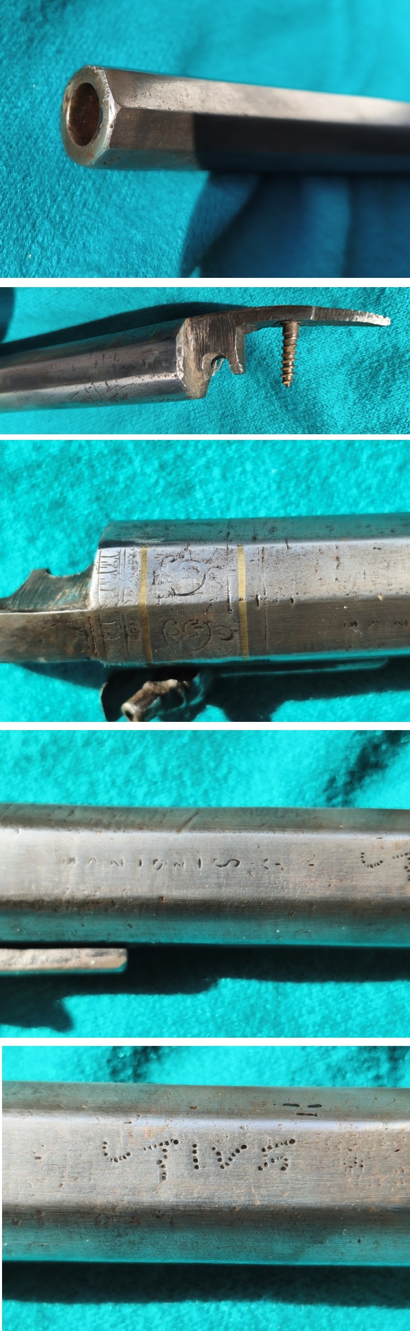 Achtkantiger Lauf, nach vorne verjüngt, Kal. 13mm glatt. Am Ansatz graviert, zwei eingelegte goldfarbige Bänder. Pistonsockel mit langer Schiene, alter Piston. Laufmaße circa: Laufansatz 27,8mm, mit Pistonsockel 39,7mm, mittig 24,42mm, vorne 22,72mm. Lauflänge 25cm, mit Schwanzschraubenblatt 31cm. Alters- & Gebrauchsspuren,Siehe Fotos.