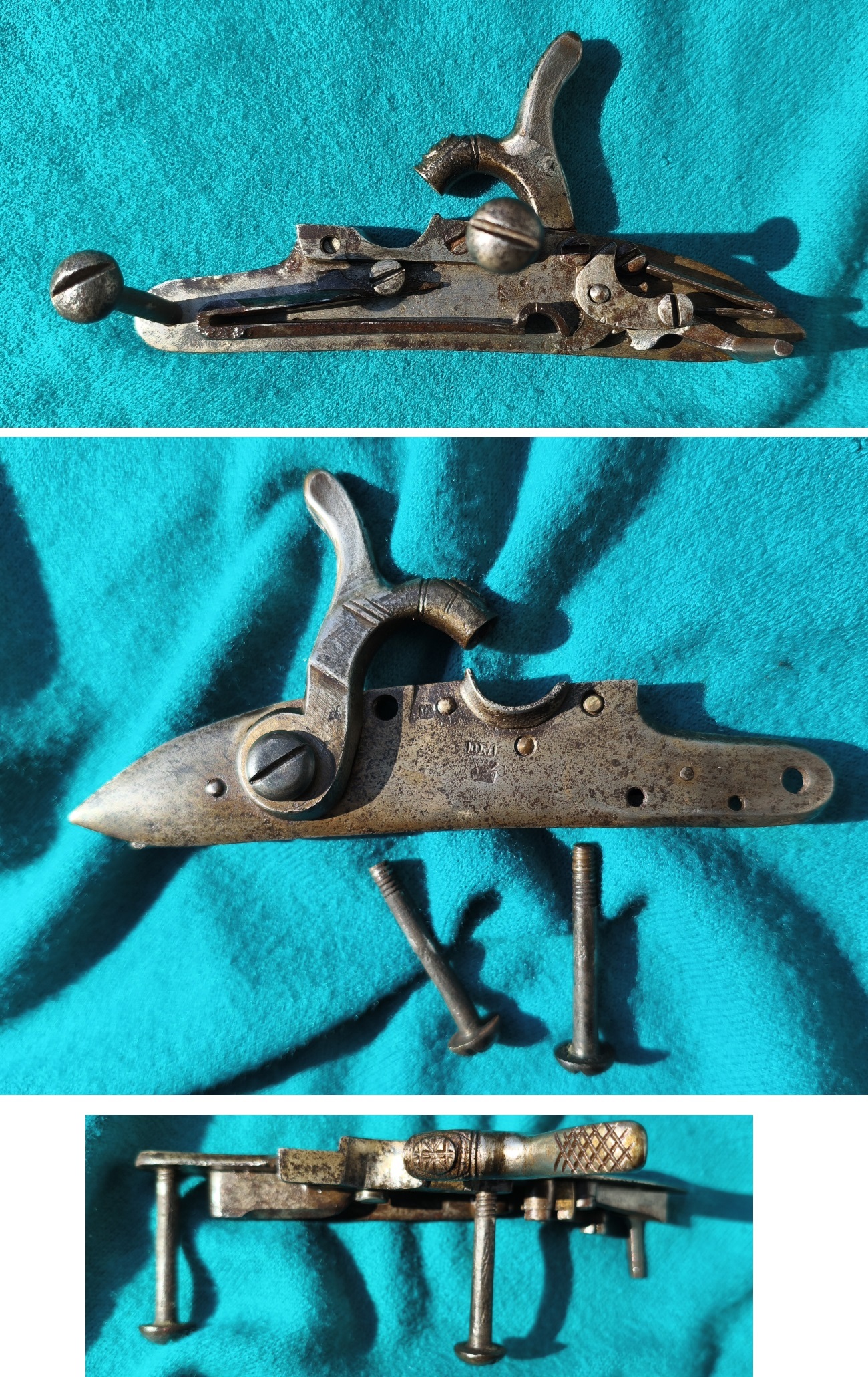 Dreifach gemarkte Schloßplatte, DM = David Maritz, Gewehrfabrik Kulembourg/NL (Danke für den Hinweis). Zwei orginale Schloßschrauben. Zwei stramme Rasten, gute Funktion. Schloßplattenlänge 17cm. Ungereinigt, Fundzustand, Alters- & Gebrauchsspuren, Siehe Fotos.