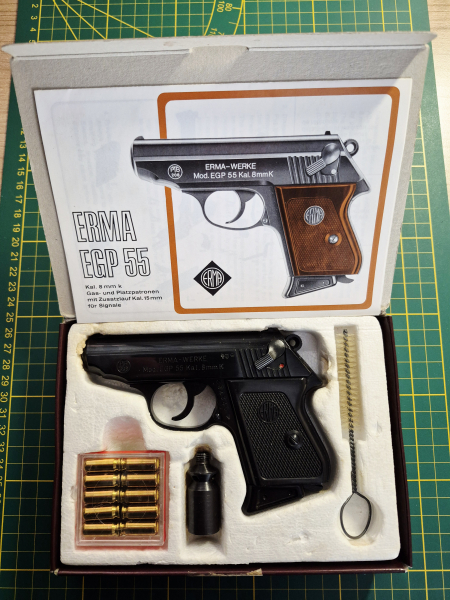 Ein weiteres Stück aus meiner Sammlung kommt zur Auktion: Erma EGP 55 als nummerngleiches Komplettset, so wie es auf den Fotos zu sehen ist. Waffe und Verpackung sind in Bestzustand. Lediglich ein Stück Klebeband auf dem Karton trübt den Gesamteindruck etwas. Eine Packung CS-Reizstoffpatronen aus dem Jahr 2003 liegen dem Set bei. Fotos sind Bestandteil der Auktion. Keine Garantie und keine Rücknahme, da Privatperson!