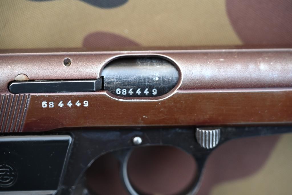 Tato pistole sloužila u sboru národní bezpečnosti a nese přejímací značky z roku 1950 “NB 50".