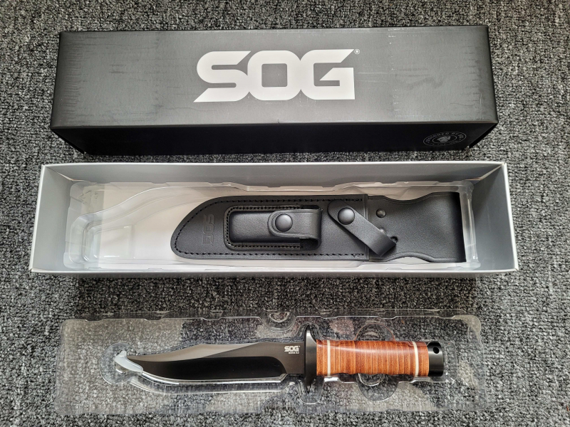 SOG Bowie 2.0 (SOG-S1T-L): Das ursprüngliche SOG Bowie Messer (oder auch "Vietnam Bowie") wurde in den 1960er Jahren von dem Amerikaner Benjamin Baker entwickelt. Es war ein Auftrag des MAC-V (Military Assistance Command, Vietnam), dem U.S. Generalstab für den Krieg in Vietnam. Dieser unterhielt mit den SOG-Einheiten streng geheime Kommandogruppen, die in ganz Südostasien von 1964-1972 eingesetzt waren. Die SOG (Studies and Observation Group) rekrutierte sich zur einen Hälfte aus U.S. Special Forces, Navy Seals und Recon Marines, zur anderen Hälfte aus einheimischen Vietnamesen (v.a. aus den Bergregionen). Bis zum Kriegsende wurden nur wenige tausend Stück dieser Messer gebaut. Die Produktion fand ausnahmslos in Seki, Japan statt, nicht in den USA. 1986 gründete sich dann die Firma SOG Knives, um dieses besondere Messer weiter zu produzieren. Technische Daten: Gesamtlänge = 27,9 cm, Klingenlänge = 16,3cm, Klingenstärke = 6 mm, Gewicht = 340 g, Stahl = AUS-8, Griffmaterial = gepresste und stabilisierte braune Lederringe mit 4 Fingermulden, schwarze Lederscheide mit Schleifstein in aufgesetzter Tasche, alle Stahlteile brüniert. Absolut neuwertig (siehe Fotos), Originalrechnung vorhanden, gekauft erst im Dezember 2025 als Sammelmesser, UVP laut Importeur BÖKER = 265,- EUR. Vollständiger Lieferumfang = Originalverpackung, Messer, Scheide, Schleifstein. Versand als versichertes DHL-Paket. Da Privatverkauf keine Garantie / kein Umtausch.
