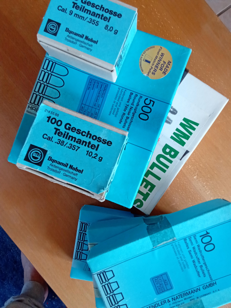 Infolge Aufgabe Wiederladetätigkeit Abgabe Restbestand Geschosse wie Foto und Beschreibung:Cal .45ACP 230grs,H&N,Blei Rundkopf(35 Stück)-WM Bullets,200grs,SWC BB (145) Cal.44 240grs, H &N, Blei Semi Wadcutter (240) Cal .38/.357 Teilmantel 10,2 g Dynamit Nobel (71) Cal 9mm/.355 Teilmantel 8,0g Dynamit Nobel