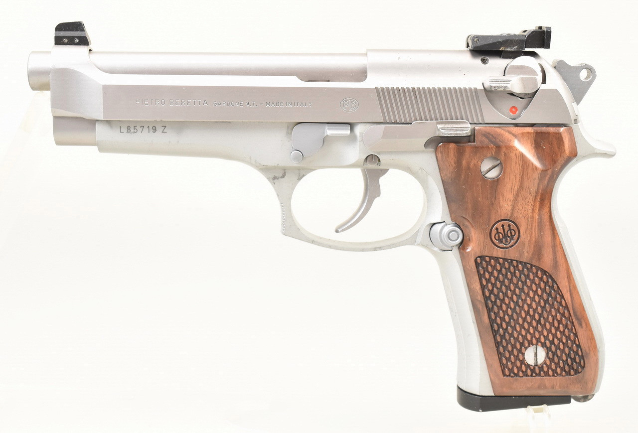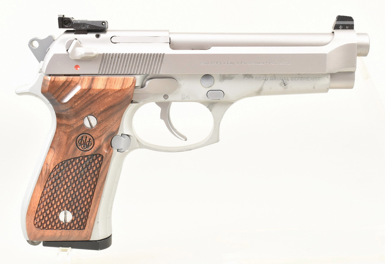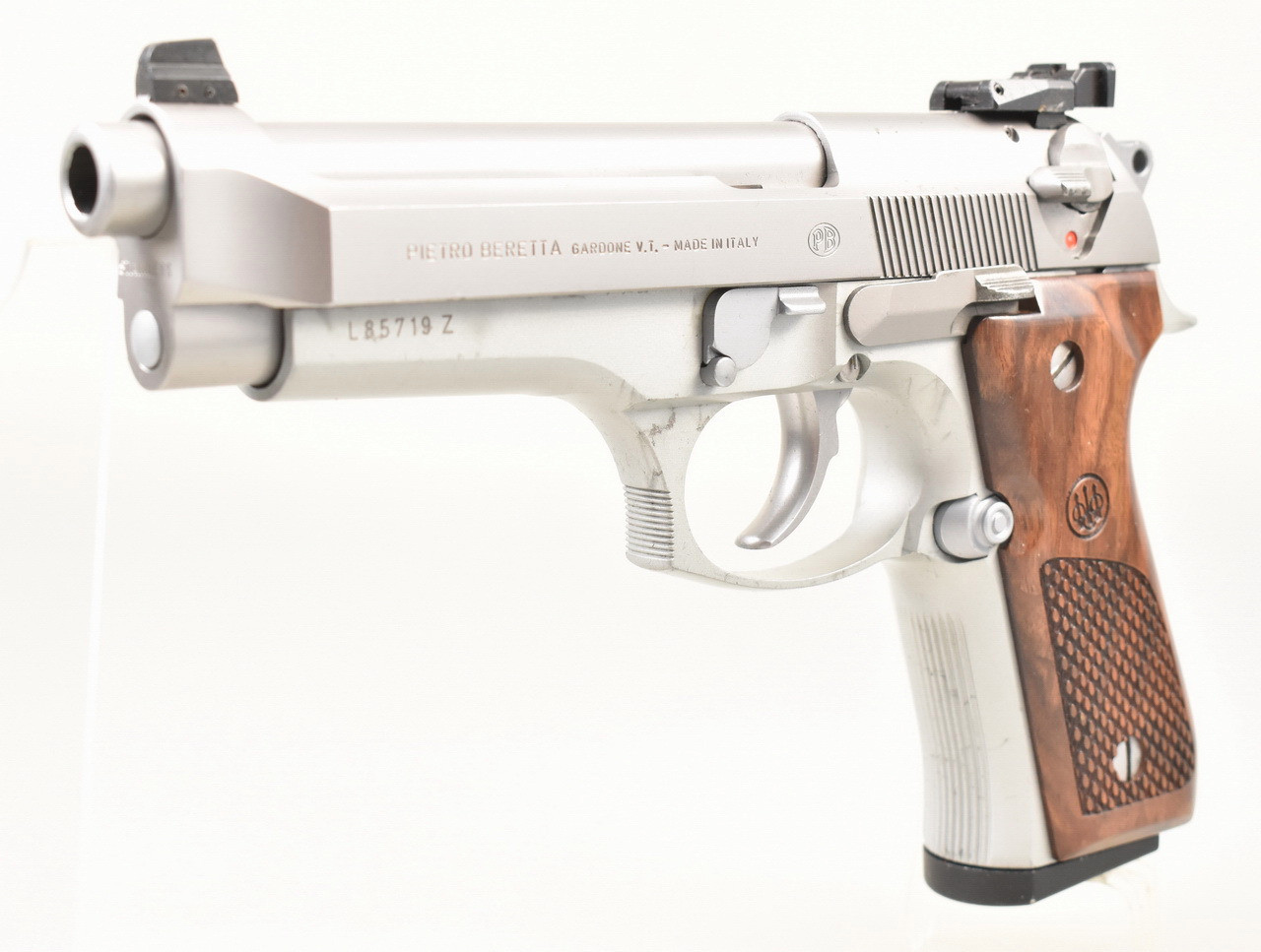 Bewährte Double - Action Gebrauchspistole mit Schwenkriegelverschluß aus Produktion der italienischen Fabbrica d´Armi Pietro Beretta S.p.A., Gardone Val Trompia. Das Modell 92 FS in der Ausführung mit Stainless - Steel Verschlußstück und silber eloxiertem Leichtmetallgriffstück. Spiegelblanker Lauf. Beschuß 1996. Später hinzugefügte, höhen- und seitenverstellbare LPA SPR Mikrometervisierung. Holzgriffschalen mit Beretta Logo sowie Kunststoffgriffschalen. Reservemagazin. Red Dot Sight Montageplatte. Gebrauchs- und Lagerungsspuren sind vorhanden. Details siehe Bilder.