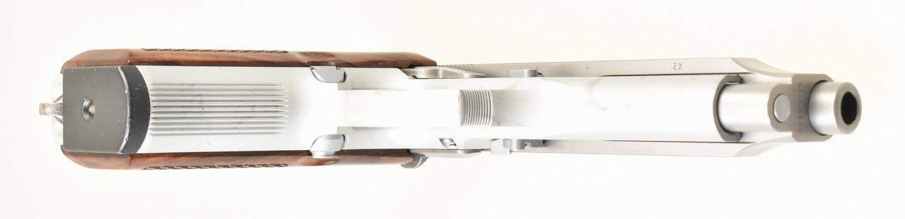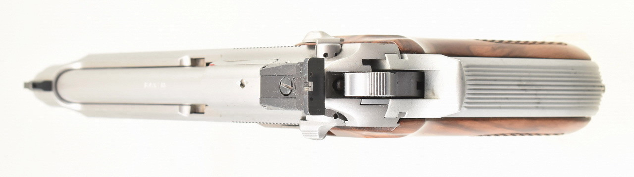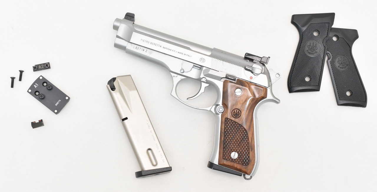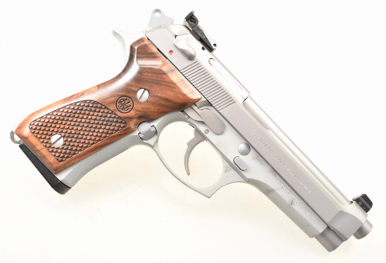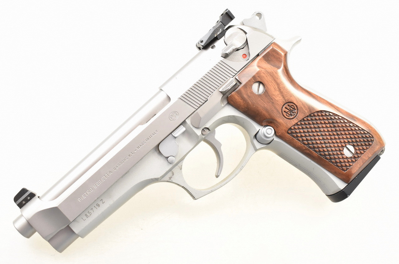 Bewährte Double - Action Gebrauchspistole mit Schwenkriegelverschluß aus Produktion der italienischen Fabbrica d´Armi Pietro Beretta S.p.A., Gardone Val Trompia. Das Modell 92 FS in der Ausführung mit Stainless - Steel Verschlußstück und silber eloxiertem Leichtmetallgriffstück. Spiegelblanker Lauf. Beschuß 1996. Später hinzugefügte, höhen- und seitenverstellbare LPA SPR Mikrometervisierung. Holzgriffschalen mit Beretta Logo sowie Kunststoffgriffschalen. Reservemagazin. Red Dot Sight Montageplatte. Gebrauchs- und Lagerungsspuren sind vorhanden. Details siehe Bilder.