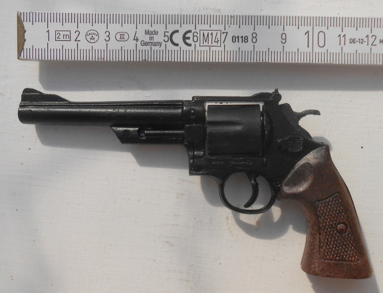 Sie bieten auf 2 Spielzeugpistolen aus Metall in sehr gutem Zustand. Ich habe keine Gebrauchsspuren an den kleinen Pistolen (Revolver 12 cm Länge und Derringer 8 cm Länge) feststellen können. Auch die Verpackungen und die Beschreibung für den "44er" sind bis auf den kleinen Riss in sehr gutem Zustand. Sind mal als Spielzeuge hergestellt worden und sollen mit einer Art Knallplättchen "funktionieren". Spannnen und abschlagen geht. Beim "44er" soll die Trommel auch ausschwenkbar sein. Habe ich aber nicht hinbekommen, hätte wahrscheinlich mehr Kraft aufwenden müssen... habe ich allerdings vermieden, da ich den Minirevolver nicht beschädigen wollte. (auf der einen Verpackung ist eine Einschränkung für Kinder unter 3 Jahren in englisch aufgedruckt).