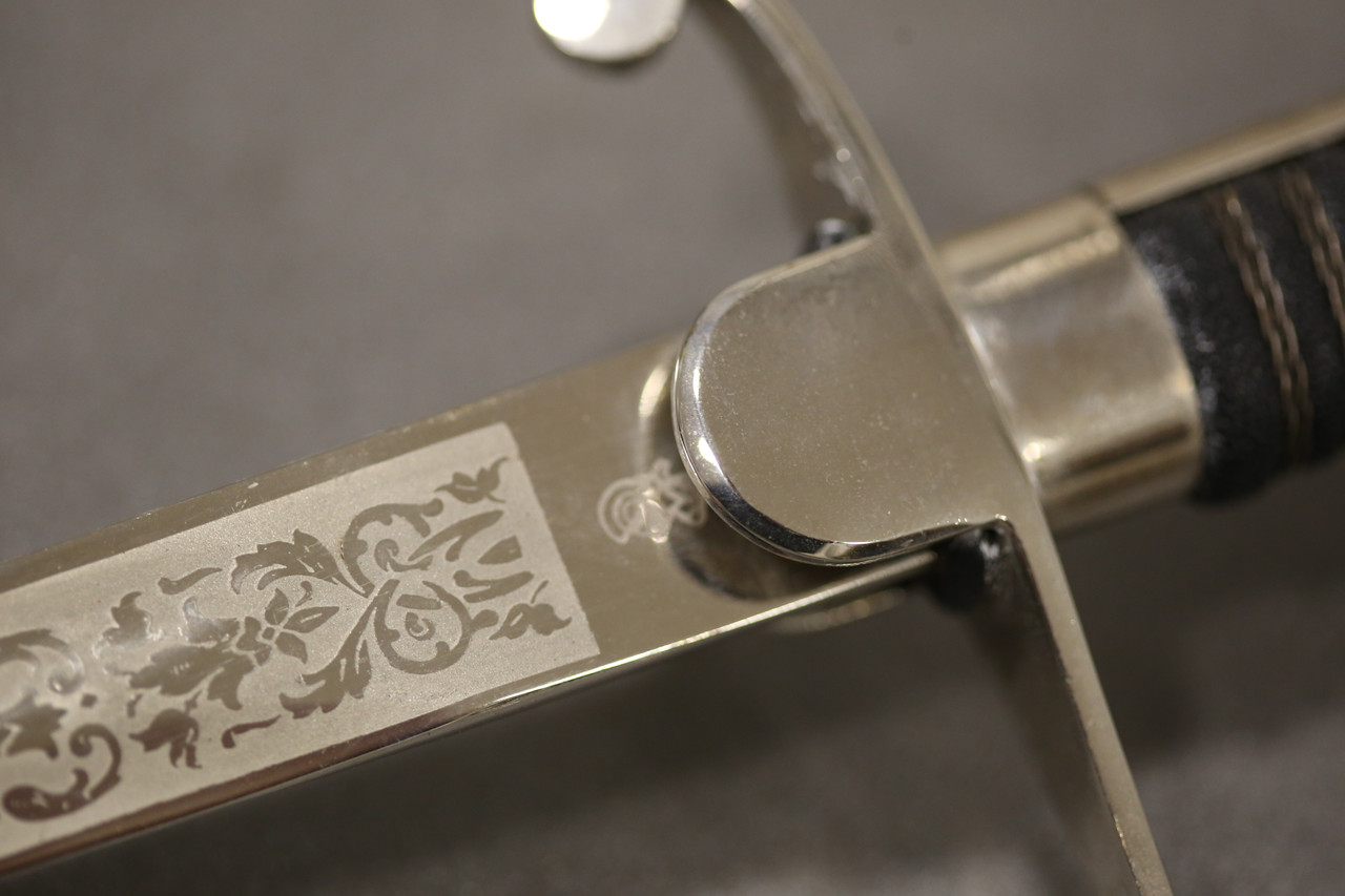 Dort wird eine beidseitig fein damaszierte/geätzte Klinge sowie eine aufwendig ausgeführte Montur beschrieben. :contentReference[oaicite:1]{index=1}