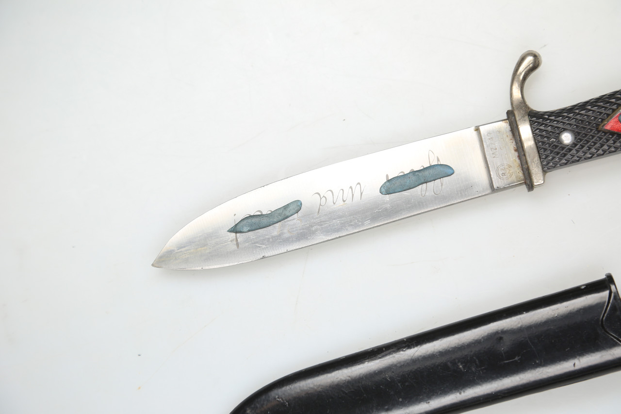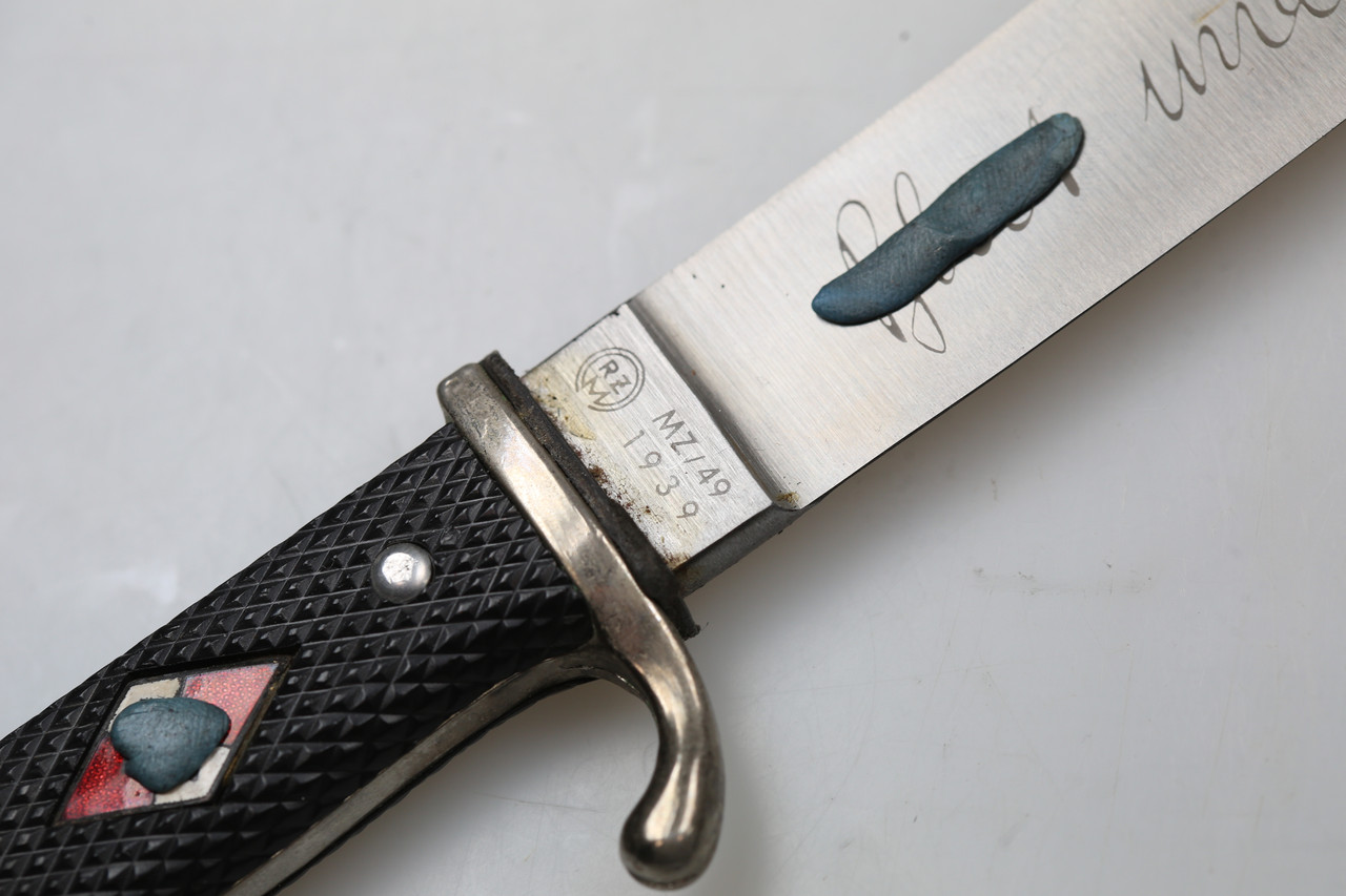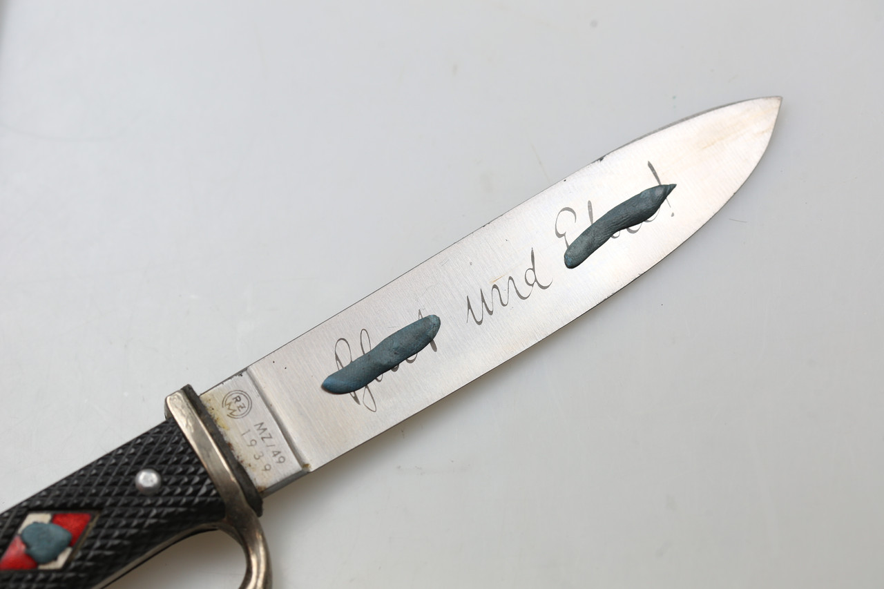 I am offering an HJ-style knife marked RZM M7/49 and dated 1939. The blade bears the motto “Blut und Ehre”.