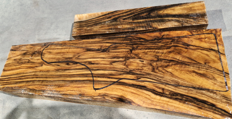 Die ersten Aufnahmen entstanden auf einem leicht angefeuchteten Holzbrett, um die Farben und die Schönheit des fertigen Produkts realistischer darzustellen. Das letzte Bild zeigt die Maße in Zentimetern. Die Konturen wurden auf die tatsächlichen Abmessungen der Blaser F3 übertragen. Die Teile wurden fünf Jahre lang luftgetrocknet. Auf Dampftrocknung wurde verzichtet, um die Farben und die natürlichen Harze des Holzes zu erhalten. Das Ergebnis ist ein elastischerer, festerer und schönerer Schaft