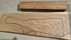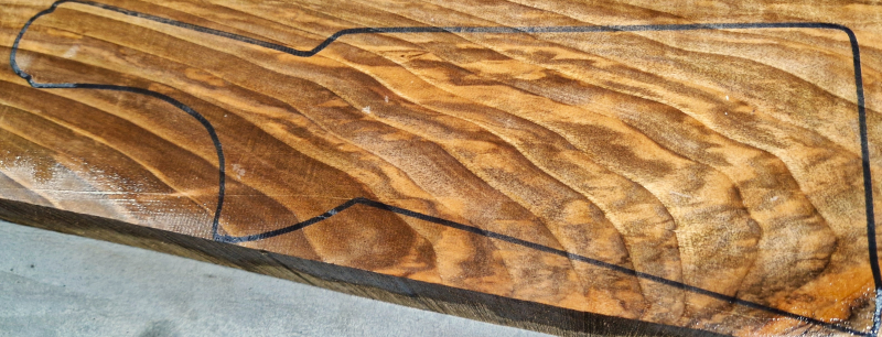 Die ersten Aufnahmen entstanden auf einem leicht angefeuchteten Holzbrett, um die Farben und die Schönheit des fertigen Produkts realistischer darzustellen. Das letzte Bild zeigt die Maße in Zentimetern. Die Konturen wurden auf die tatsächlichen Abmessungen der Blaser F3 übertragen. Die Teile wurden fünf Jahre lang luftgetrocknet. Auf Dampftrocknung wurde verzichtet, um die Farben und die natürlichen Harze des Holzes zu erhalten. Das Ergebnis ist ein elastischerer, festerer und schönerer Schaft