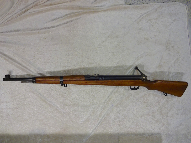Seltenes Militär Mehrlade Luftgewehr mit Repetierfunktion. Wiegt fast 4 kg um dem original Karabiner sehr nahe zu kommen. Fast ca.15 Rundkugeln im Kaliber 4,4mm(besser 4,46mm), die hintereinander durch Repetieren verschossen werden können. Länge 107 cm. Die Kugeln werden auf der Laufhülse mit Schieber geladen. Das Gewehr dürfte aus den 40/50er(?) Jahren stammen. Eine Halbrund Sicherung befindet sich am Hülsenkopf/Ende.