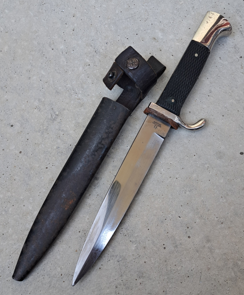 Verkaufe ein originalen deutschen Grabendolch von Robert Klaas, Solingen, aus dem I. Weltkrieg mit originalem Stoßleder. Holzgriffschalen im Top Zustand. Die Klinge hat den originalen scharfen Schliff, die Lederschlaufe ist schön fest und kräftig. Der Knopf schließt ebenfalls kräftig und fest. Alles in allem ein ausgezeichneter und ausdrücklicher Sammelzustand!