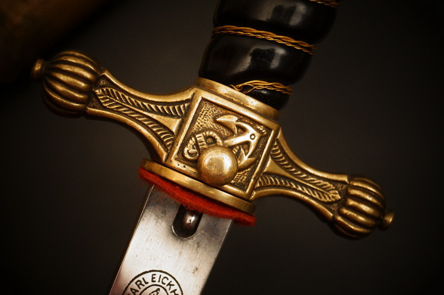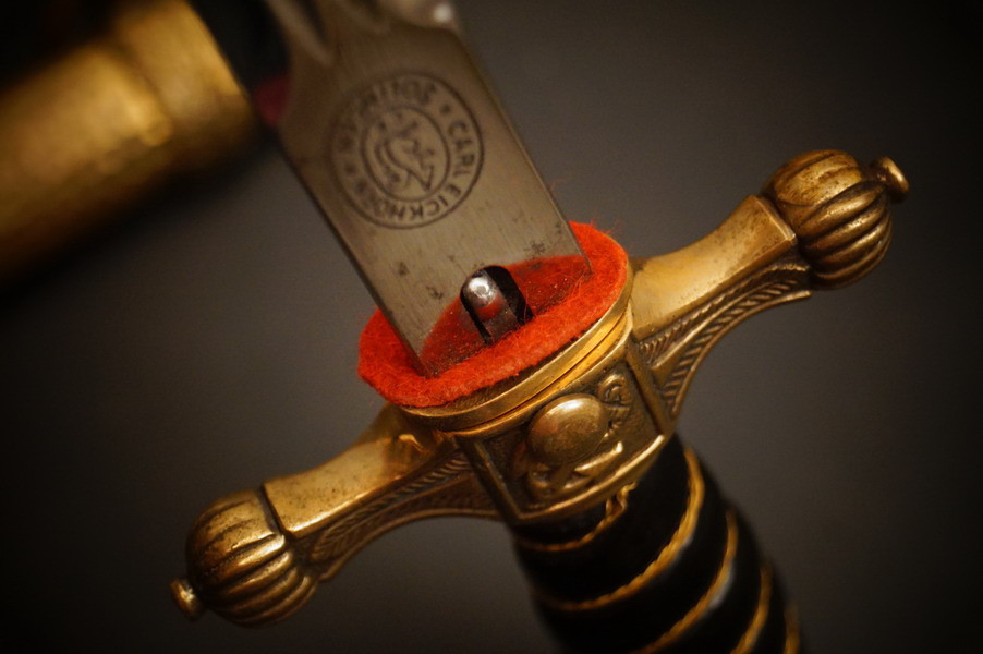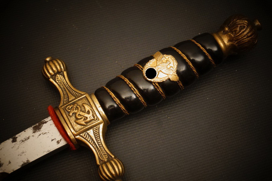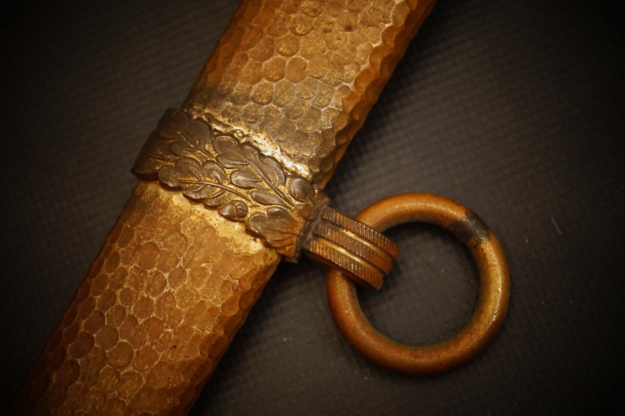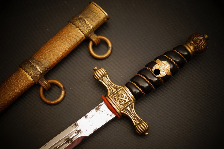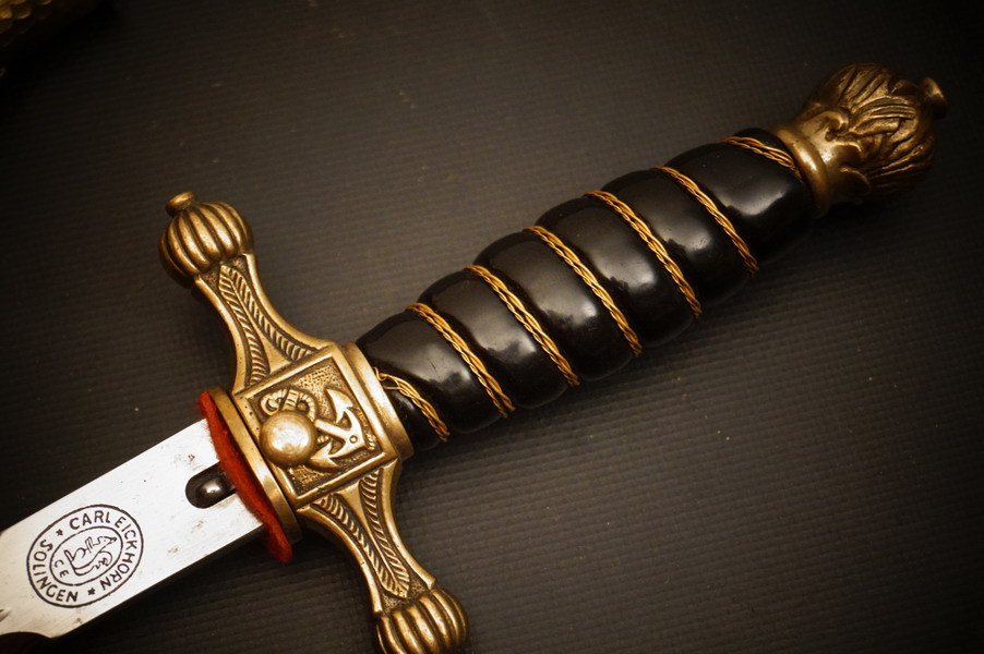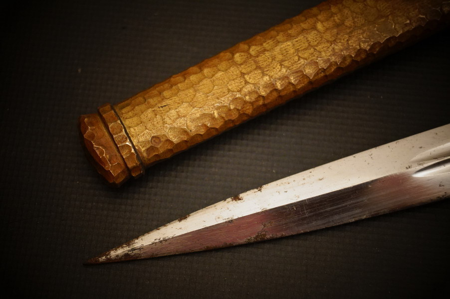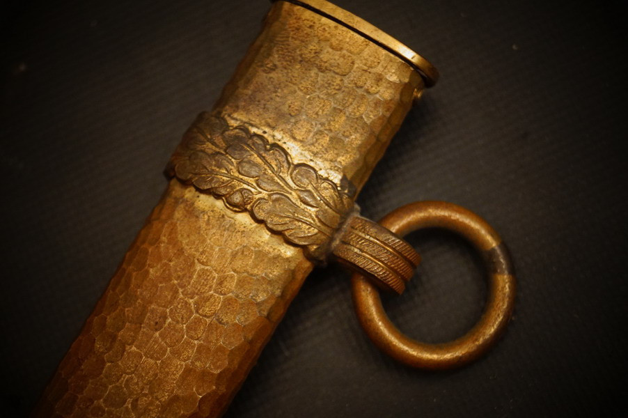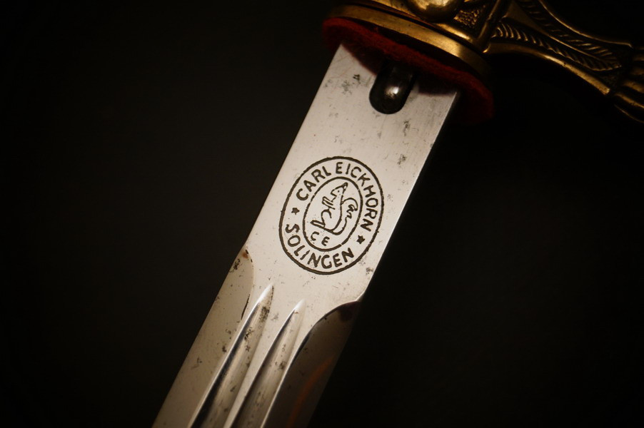 Fundzustand. Bronzescheide, gehämmerte Ausführung saugend. Dolch läßt sich öffnen. Stahlklinge und Cellongriff in schwarz, Holzkern - keine Risse. Polizei-Wasserschutz Emblem auf dem Griff versplintet. Bronzebeschlagteile. Klinge mit doppelter und beidseitiger Kehlung sowie Hersteller Eickhorn.