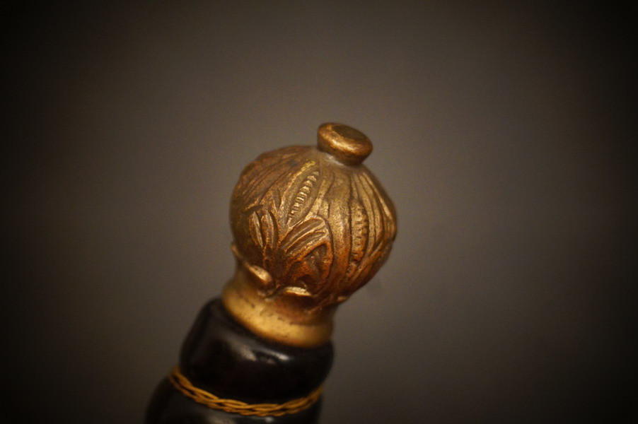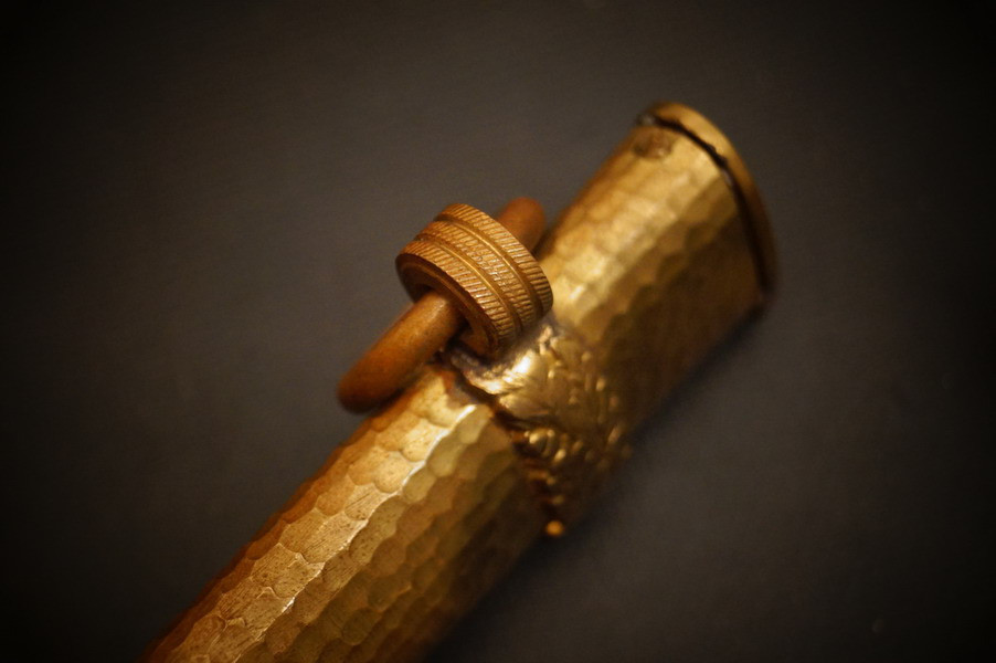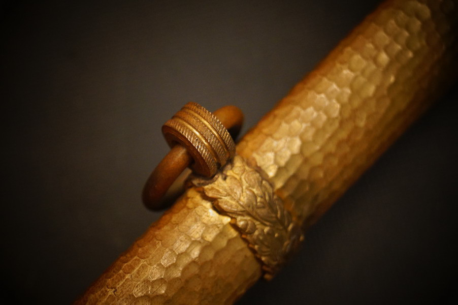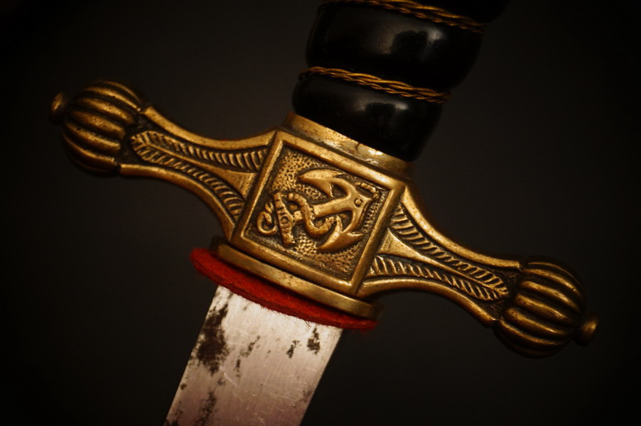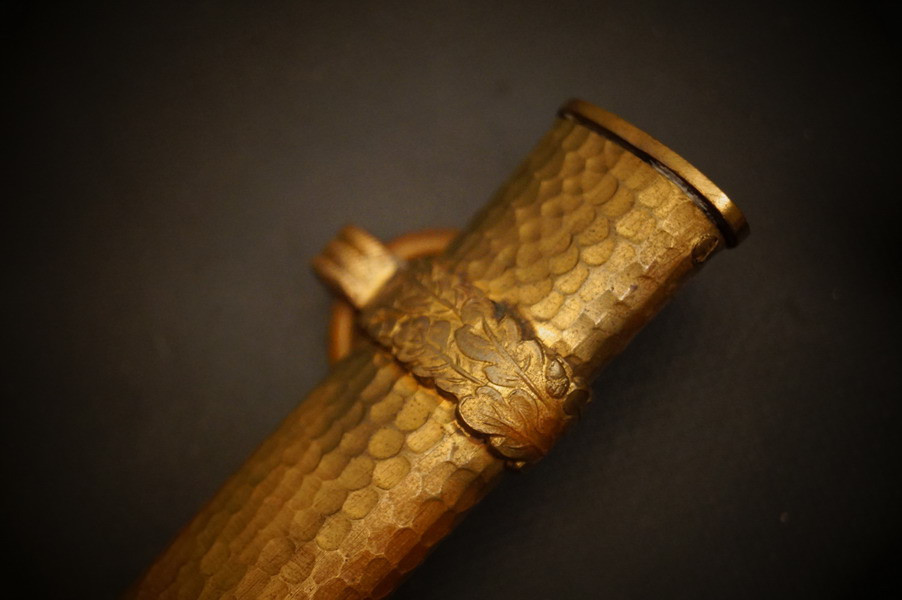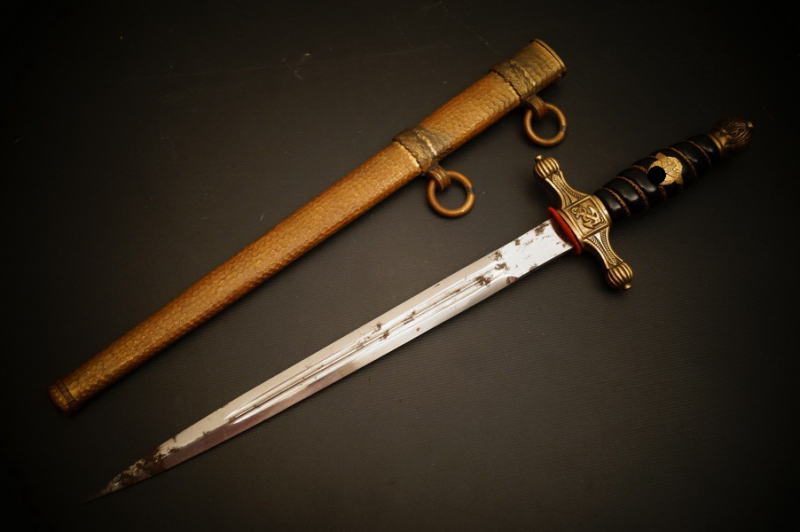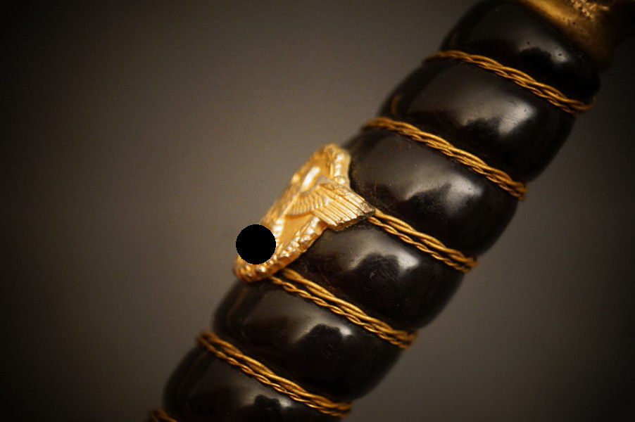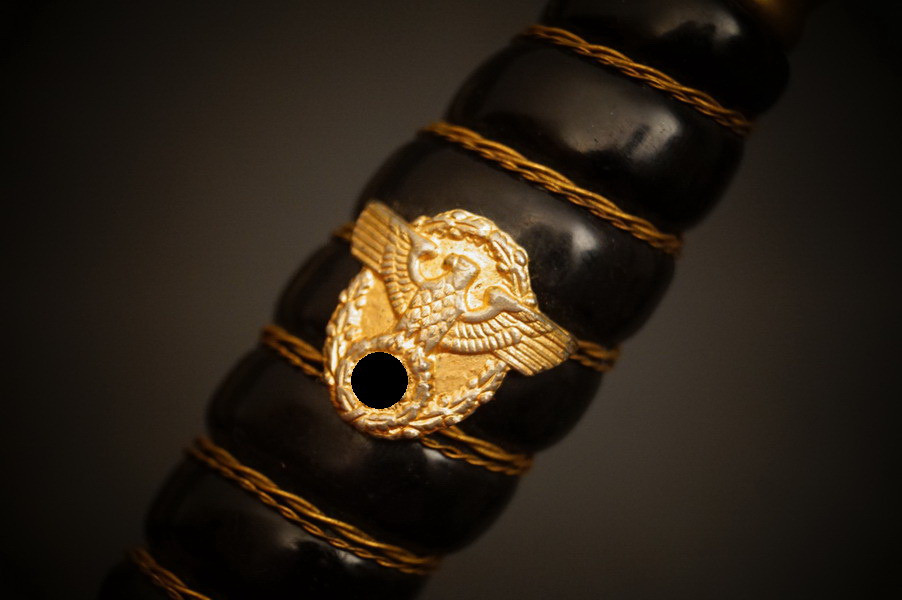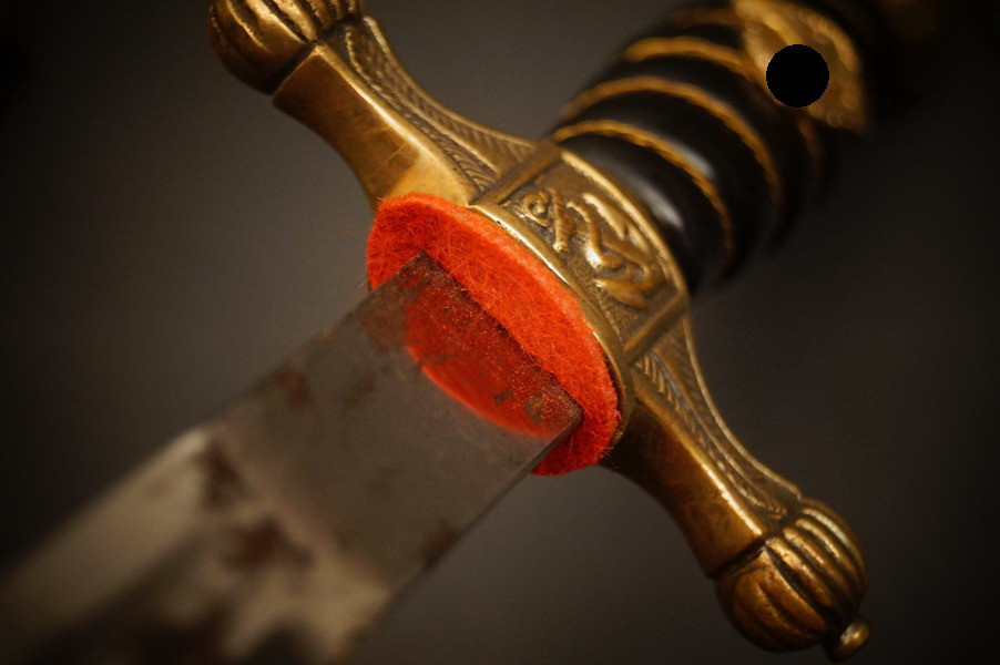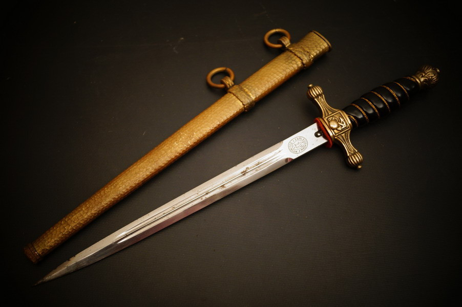 Fundzustand. Bronzescheide, gehämmerte Ausführung saugend. Dolch läßt sich öffnen. Stahlklinge und Cellongriff in schwarz, Holzkern - keine Risse. Polizei-Wasserschutz Emblem auf dem Griff versplintet. Bronzebeschlagteile. Klinge mit doppelter und beidseitiger Kehlung sowie Hersteller Eickhorn.