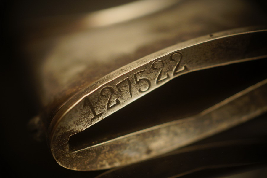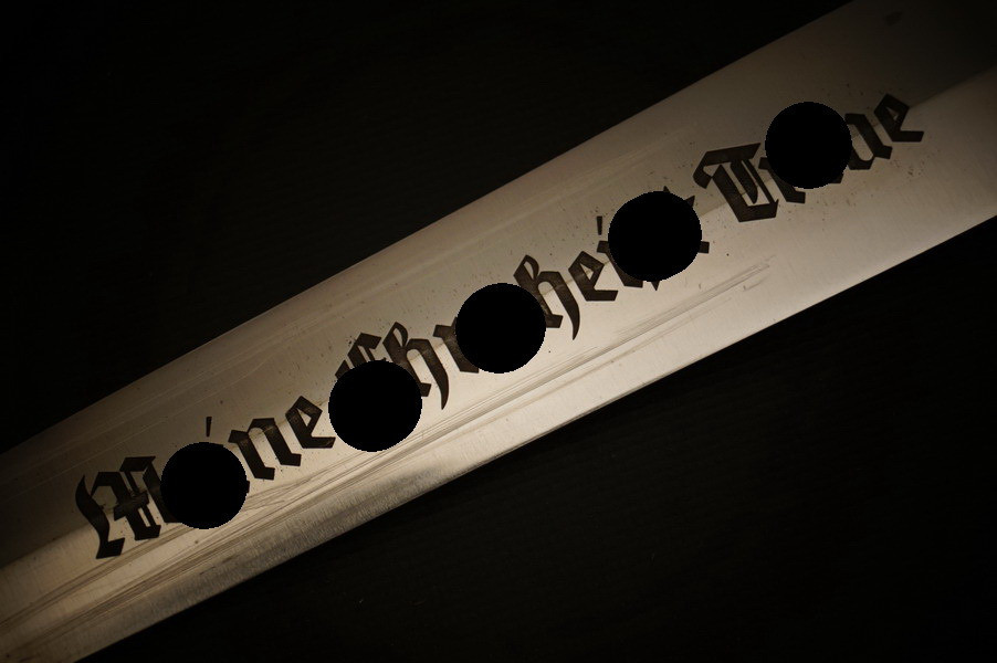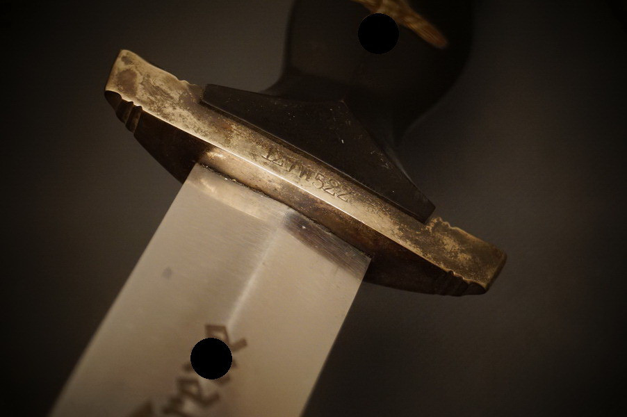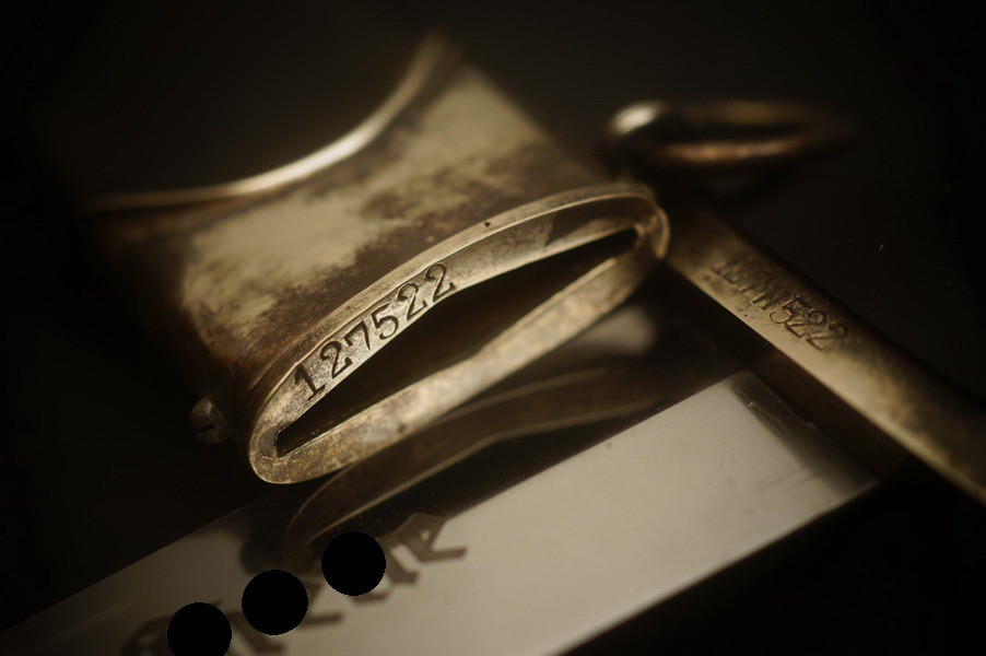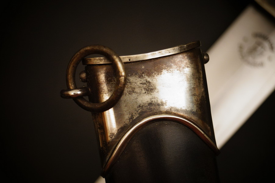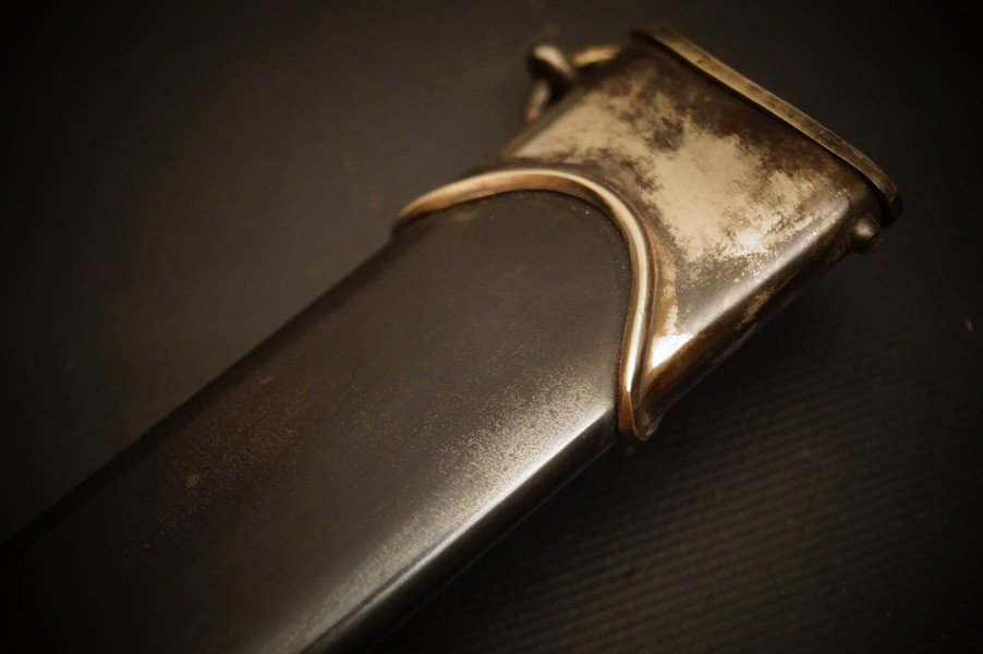 Stahlscheide mit der alten Brünierung, teils abgerieben und teils noch alter Zapponlack drauf. Saugende Scheide mit zwei Zungenfedern - perfekter strammer Sitz der geschmiedeten Klinge in der Scheide. Scheide mit Neusilber Beschlagteilen, obere Beschlag mehrteilig mit Scheidenmundblech. Scheidenmund mit Nummer. Klinge im Gesenk geschmiedet und mit Schmiedemarkierung. Parierstangen aus Neusilber paarig mit P und A innen. Kopfschraube aus Neusilber wie auch der Adler und die Pastille. Untere Parierstange mit Römisch 2 und Trägernummer - Nummerngleich zur Scheide. Holzgriffstück ohne Risse. Hersteller und Motto sind geätzt und teils noch hell gräulich.