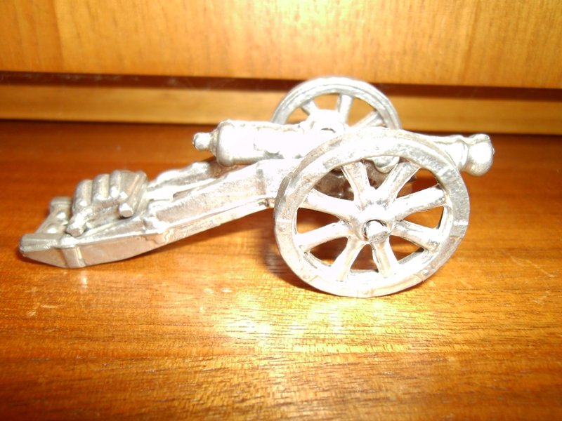 Zubehör für Zinnsoldatensammler: Kanone aus Zinn mit beweglichen Rädern und abnehmbarer Ausstattung. Bestehend aus 3 Teilen. 8,5 cm lang, 4 cm breit, 3 cm hoch.