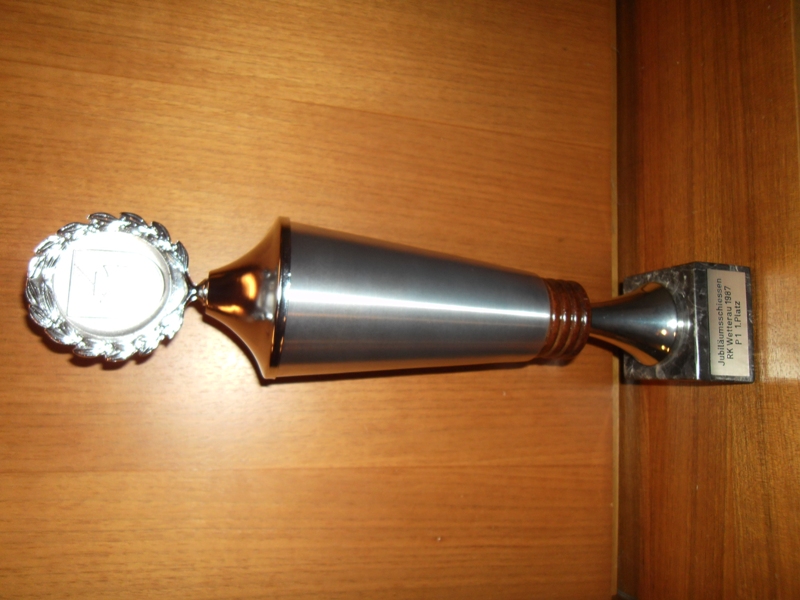 Deckel-Pokal der Reservisten der Deutschen Bundeswehr (Jubiläumsschiessen RK Wetterau 1987 P 1 1. Platz) Schwarz grauer Marmorsockel 6,5 x 6,5 x 4 cm. 4 Holzringe unterhalb der konischen Kuppa aus Aluminium. Auf dem Deckel Wappen des Reservistenverbandes auf einer Medaille und Lorbeerkranz rundum. 2 kleine Kratzer sonst guter Zustand. Höhe 38 cm.