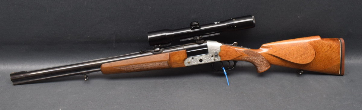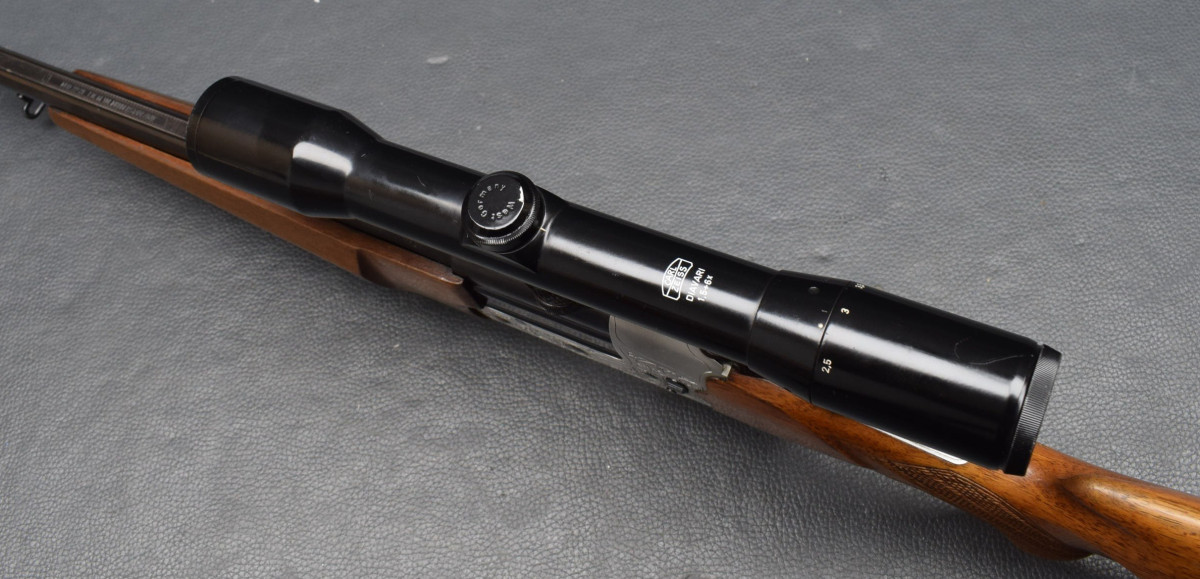 Montiert mit Zeiss Diavari 1,5-6x42 Absehen 4, mittels SEM Montage. Nußbaumschaft mit Backe, Schaftkappe & Riemenbügeln.
