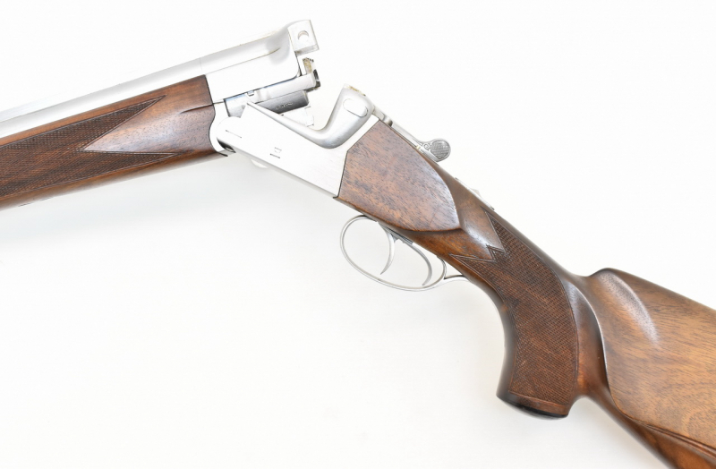 Weißfertiges Meisterstück auf " KRIEGHOFF Teck " Basis. Stahlbasküle mit Kerstenverschluß und doppelter Laufhakenverriegelung. Signalstifte zur " gespannt " Anzeige der Schlosse. Vorderer Abzug mit Rückstecherfunktion. Geteilte Auszieher. Klassisch, fest verlötetes Laufbündel mit spiegelblanken Läufen. Ulmer Beschuß 1986. 365mm langer Schaft für Rechtsschützen mit leichtem Schweinsrücken und bayerischer Doppelfalzbacke ( Schaftlänge gemessen vom vorderen Abzug bis Mitte Gummischaftkappe ). Pistolengriff und Vorderschaft mit Fischhaut. Mit Lagerungsspuren. Details siehe Bilder.