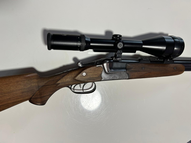 Montiert über eine Suhler-Einhak-Montage ist ein Zielfernrohr, Schmidt & Bender, Abs. L1 mit Leuchtpunkt. Das Zielfernrohr hat leichte Kratzer im Eloxal, die die Funktion nicht beeinträchten, siehe Fotos.