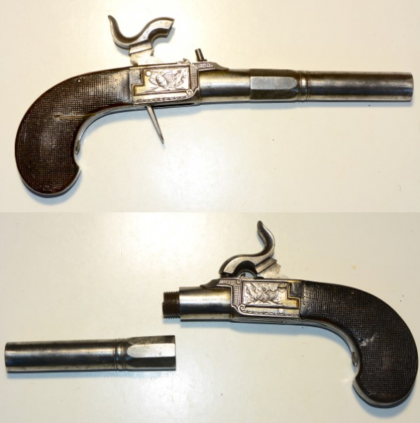 Perkussionspistole großes Terzerol mit Schraublauf und Klappabzug, um 1800, aptiert von Steinschloss, keine Stempelung aber recht hochwertig gearbeitet, wahrscheinlich französisch, Lauflänge 12,7cm, Gesamtlänge 24,1 cm, Kaliber 12,5 mm