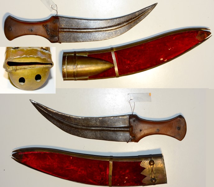 Orientalischer Krummdolch, Klinge ähnlich wie ein Jamba, flache Horngriffschalen, die etwas verzogen sind, auf der Scheide ein Messingfutteral angebracht, in dem wohl 2 Stäbchen waren, das Ortblech fehlt. KJlingenlänge 18,1 cm, Gesamtlänge 20,3 cm