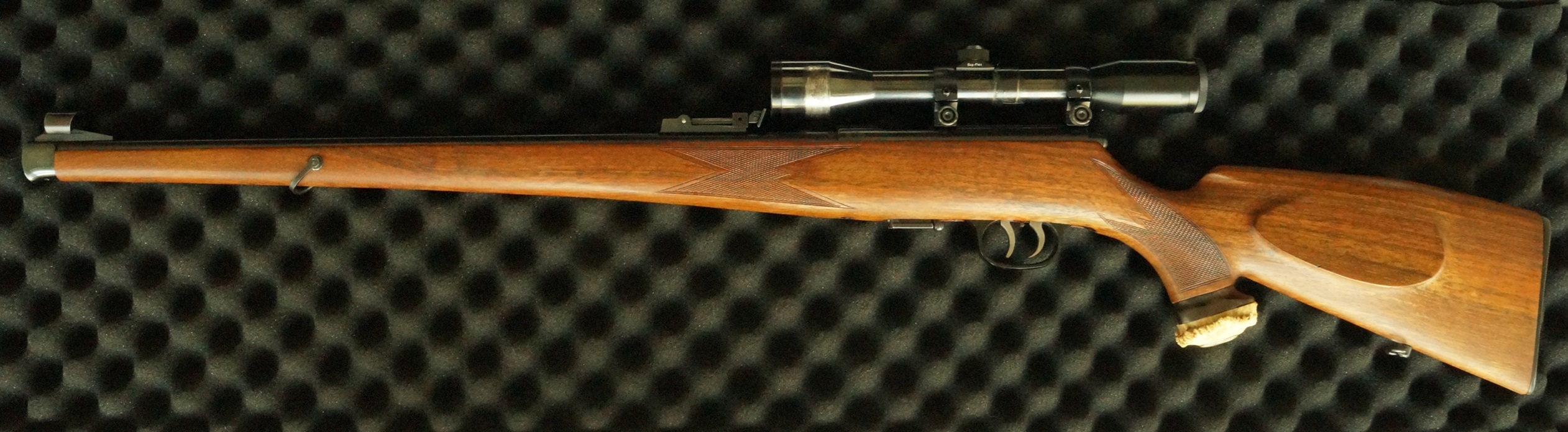 Montiert ist ein älteres Zielfernrohr mit Absehen 1 und Dioptrienausgleich. Nach unserer Einschätzung handelt es sich sehr wahrscheinlich um ein B. Nickel Marburg Supra 4x36. Eine 100% verbindliche Bestimmung des exakten Modells können wir jedoch nicht zusichern. Das Glas ist optisch und äußerlich deutlich gebraucht, technisch jedoch je nach Prüfung vor Ort zu bewerten.