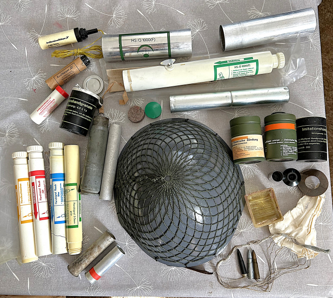 3 x M 43 AK EX-Patronen, 1x Fallschirn HS 40mm, 1x Plastikpackung M-43 Platzpatronen, 2x Kal. 4 Signalpatronen Rauch rot und 3 Stern grün, 1x Knallkörper "D", 2x Artillerieknallkörper "A" & "B", 1x Geschoßhülse (Sowj.) 23mm, 1x Innenhülse Handsignal 3-Stern, 50 mm HS grün mit Innenhülse und Alu.-Verpackungshülse, 2x Imitationshandgranaten, 2x Nebelwurfkörper Elek. Orange mit Teils Zundeinheit (Verzögerungszünder mit Anzünder), 3x Handsignale Rauch rot-blau und 3-Stern grün, 1x Handleuchtzeichen gelb und 1x Stahlhelm grau Lackiert-Nachlackiert mit Netz. Siehe Bilder !