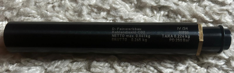 Hier verkaufe ich eine gebrauchte, originale Feinwerkbau CO2 Kartusche Mod. 2, C10, C20, C5 (1834.220.2) 41g.