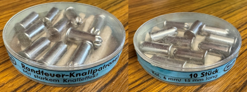 zum Verkauf steht eine Dose mit 10 Stück Platzpatronen Wadie Kal.: 6mm lang / 6x15 mm Knall. Sind originalverpackt und waren kühl/trocken gelagert.