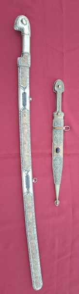 hier: die abgebildeten Blankwaffen. Ein Schaschka mit wunderschönen Verzierungen sowie ein dazu passender Dolch. Siehe Bilder.