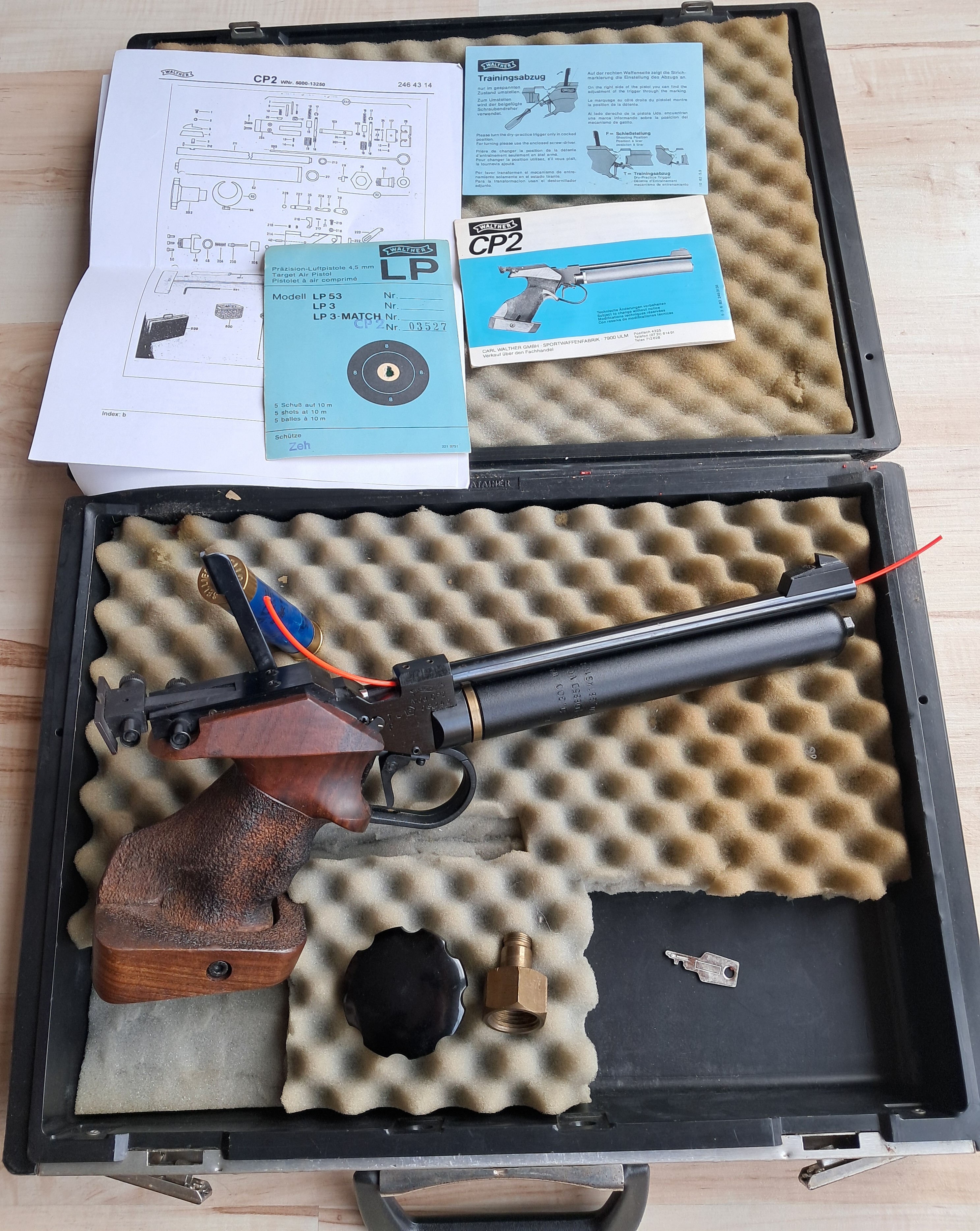Mit dabei ist wie abgebildet ein original Walther-Koffer (inkl. 2x Schlüssel), Anleitung & Schussbild, Begleitpapiere, CO2-Fülladapter, Drehgriff//Schlüssel zum Lösen der Kartusche und 1x Walther CO2-Kartusche mit TÜV bis 2019.