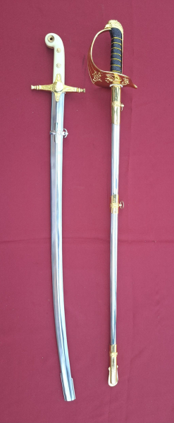 hier die abgebildeten sehr schönen Blankwaffen: 1 US-Prachtdegen mit Klingenverzierungen und Adlerkopf als Griffknauf ( Gesamtlänge 97cm / Klinge 74)