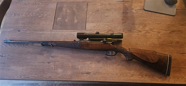 Stey Mannlicher Schönauer, Modell 1950 im Allroundkaliber 7 x 64. Die ideale rep. Büchse mit herorragender Schussleistung auf alles heimische Wild. Variables 1,5-6 x 42 Diavari D Glas von Hensoldt Wetzlar. Absehen vermutlich "8". Montiert mit einer 3 Punkt SEM. Die Holzklasse ist seinerzeit scheinbar eine etwas bessere gewählt worden. Am Pistolengriff, sowie am Vorderschaft zudem individuelle Eichenlaubdrechselei. Patronendeckelboden monogrammiert "HB".