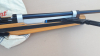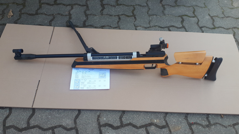 Anschütz 2001 Super Air mit verstellbarer Iris von AHG und verstellbaren Ringkorn von Walther. Das Luftgewehr funktioniert einwandfrei. V0 174m/s mit 0,53g Diabolos. Das Gummi von der Schaftkappe ist an der Spitze beschädigt. Außerdem fehlt der Anschlag am Spannarm, weswegen der Schaft an dieser Stelle Gebrauchsspuren hat ( Bild 6 ). Der Schaft hat dellen und kratzer. Die Brünierung ist noch recht gut.