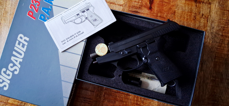 Eine Sig Sauer P239. Diese Pistole hat einen Stahllauf und keine sìchtliche Sollbruchstelle. Ich war überrascht das es sowas noch gibt. Die kleine Quittung ist sehr schwer zu lesen, wann sie verkauft wurde. Evtl. 2000. Es ist eine sehr schöne und sehr gut verarbeitete Pistole. Stahllauf, keine Sollbruchstelle ,toll !