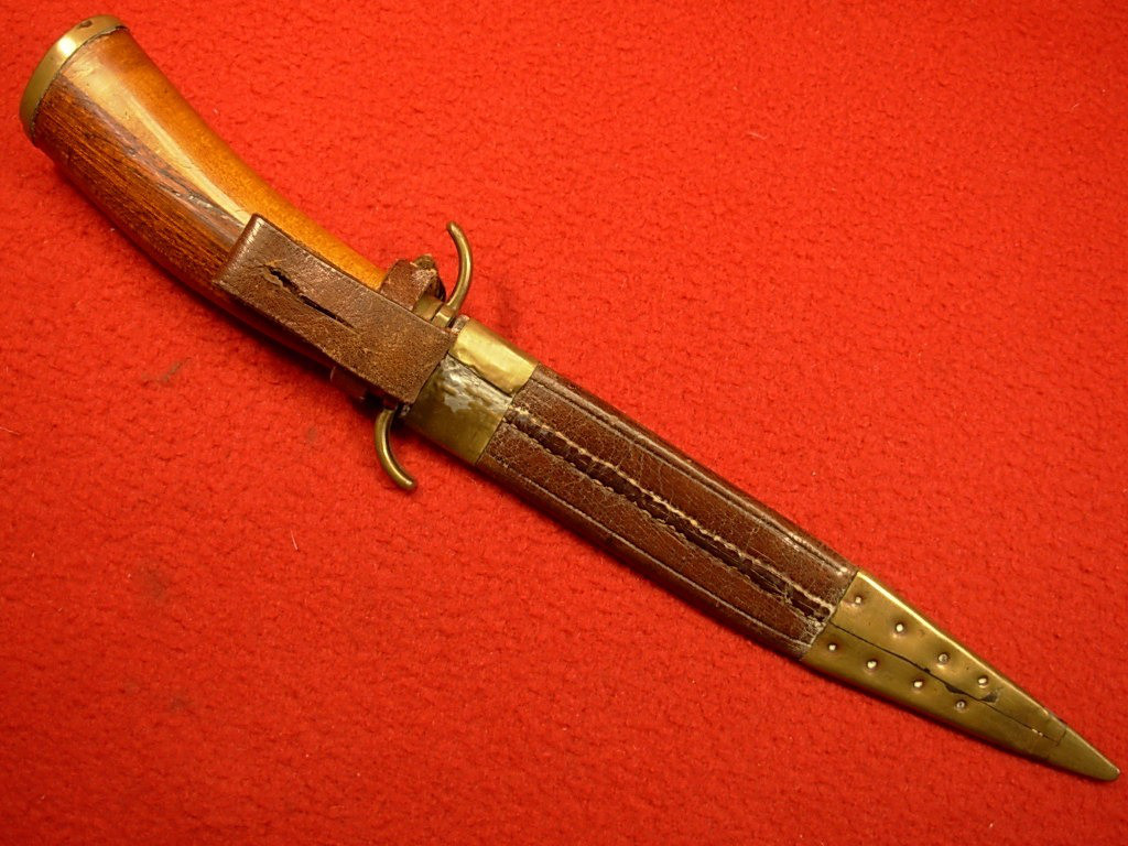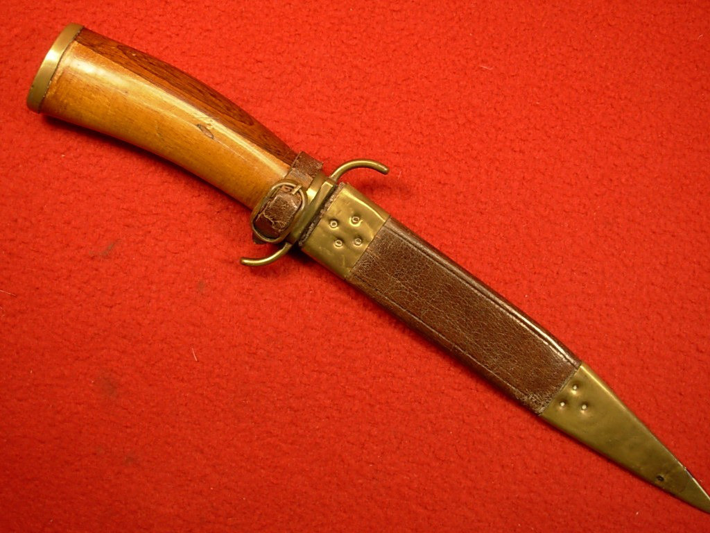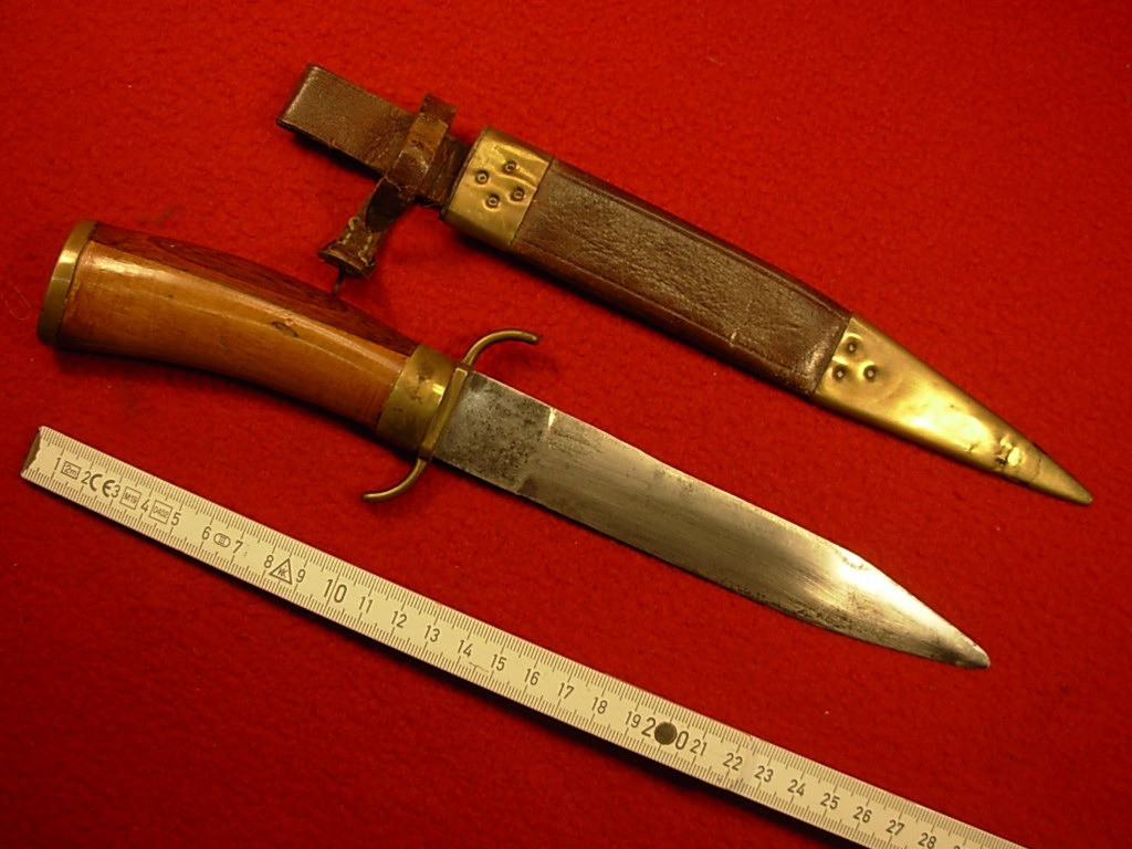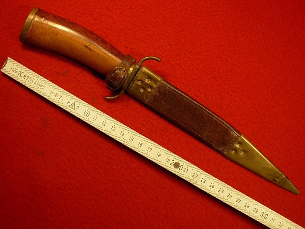 Alter originaler Jagddolch 1800 – zweischneidige Dolchklinge – Lederscheide mit Beschlägen –