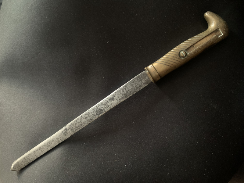 Deutsches Bajonett Infanterie Seitengewehr M 1871 …Oder was davon übrig geblieben ist. Ich musste lange suchen um es zu identifizieren. Die Klinge wurde anscheinend ersetzt sie ist sehr stumpf und hat eine merkwürdige Spitze. Parierstangen nicht mehr vorhanden. Der Griff wurde anscheinend als Hammer benutzt zahlreiche Dellen. Alles in allem sieht es so aus als wurde das Bajonett zu einem speziellen Werkzeug umfunktioniert. Und sehr oft benutzt.