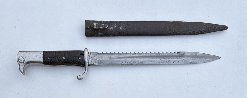 Dies ist ein KS98-Sägeblattbajonett, hergestellt 1905 in Erfurt. Das Modell aus dem Jahr W05 ist sehr selten, das Bajonett ist jedoch in schlechtem Zustand und die Scheide weist ein Loch auf. Scheide: K.S.9594.