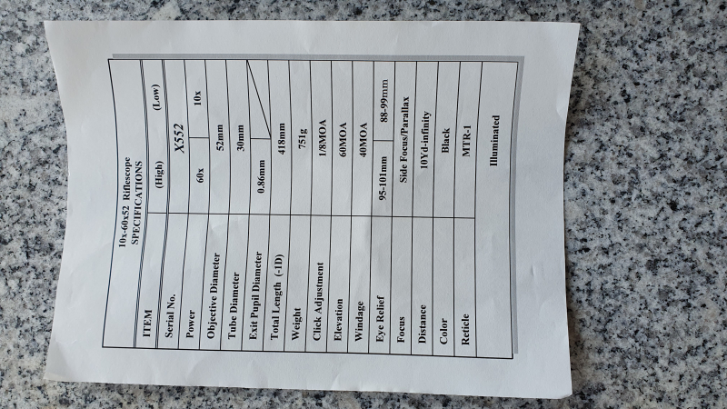 The scope features the MTR1 reticle in the second focal plane and can be illuminated in red with five brightness levels. A barely used CR2032 battery is included.