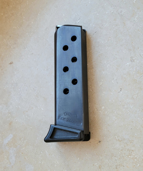 Sie bieten auf ein gebrauchtes original Walther PPK Magazin im Kaliber 7,65 mm mit Verlängerung.