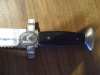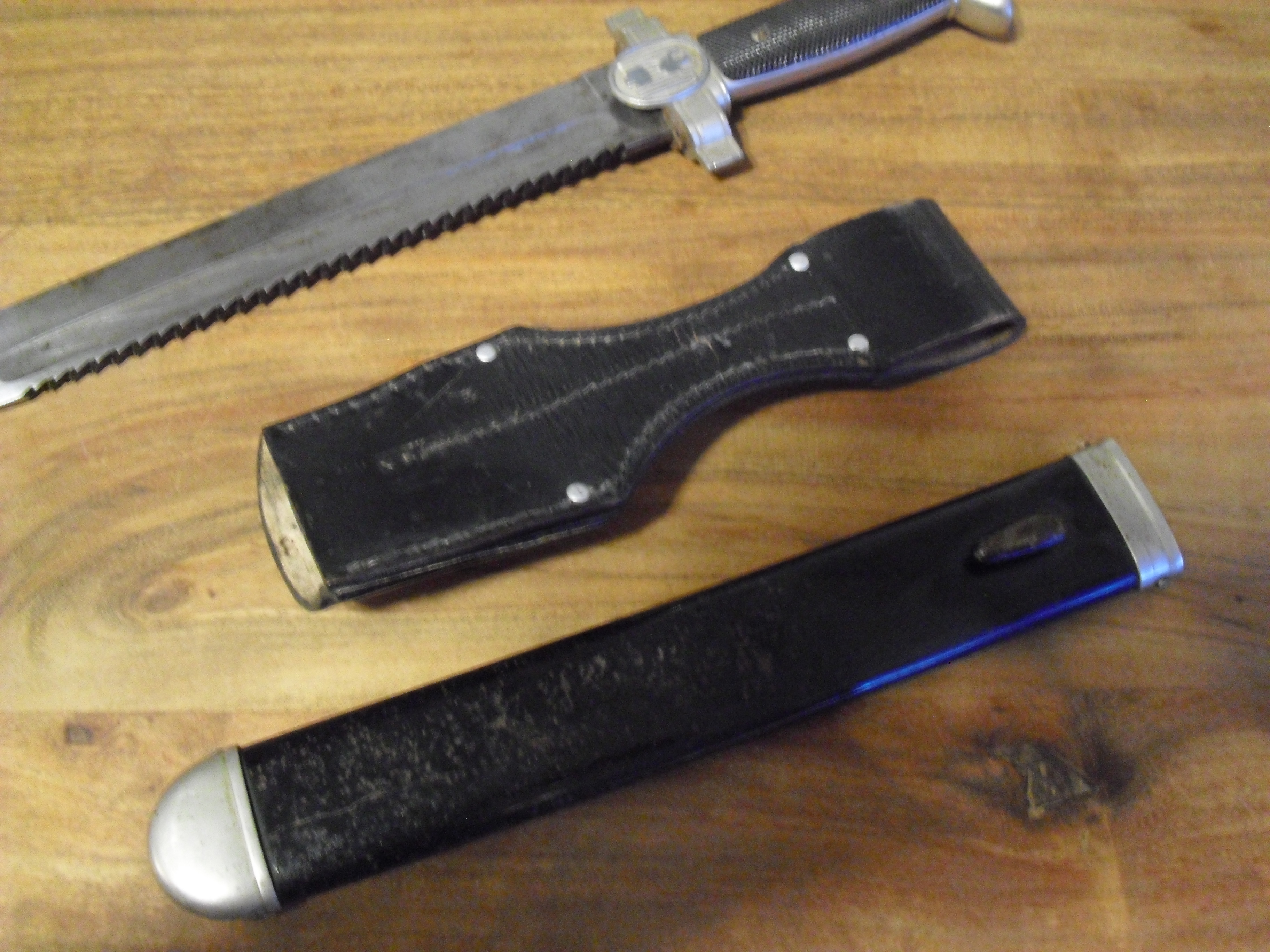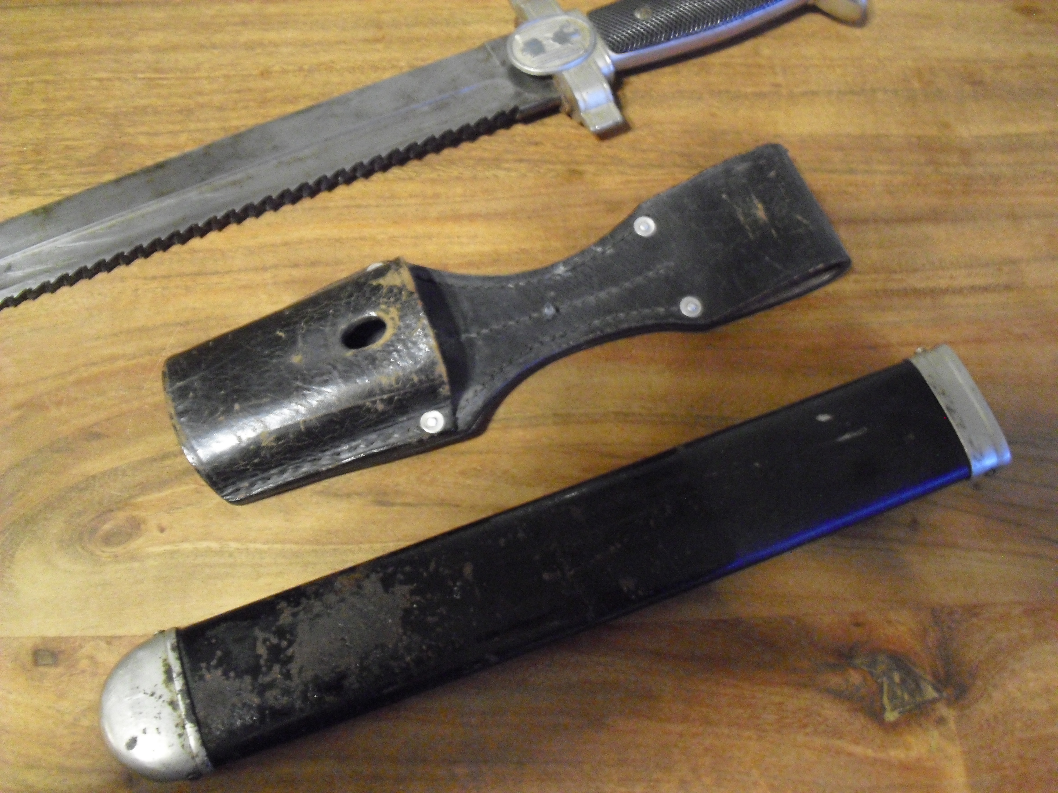 Die hintere Griffschale hat leider einen kleinen Bruch und die Scheide ist leicht flugrostig. Dennoch ist er sicherlich in einem guten Zustand.