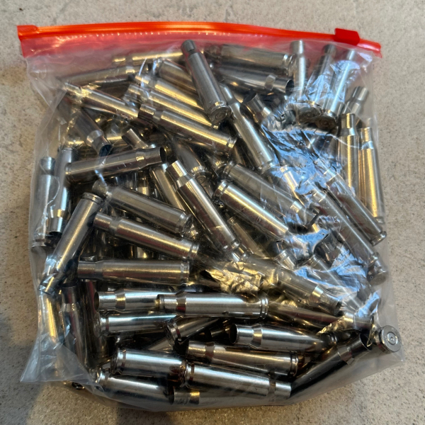 Hier versteigere ich noch einmal 100 Stück originale, vernickelte RWS Hülsen, Kaliber .308 Winchester.