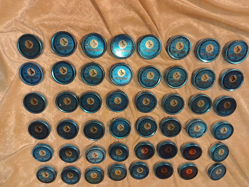 Unberührter Posten mit insgesamt 48 Schachteln Diabolos 4,5 mm der VEB Sprengstoffwerke Schönebeck. Bester Zustand, mit Beilagezettel. Dazu 3 Schachteln 4,4mm Punktkugeln aus der selben Fabrik. In dieser Menge kaum noch zu bekommen. Haben schon Sammlungs Charakter. Privatverkauf.